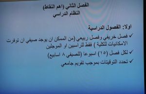 تناولت الورشة 5 محاور جاء في المحور الأول التعريف بنظام بولونيا والغرض والأهداف من النظام وشرح أهم المصطلحات الواردة ضمنه. أما المحور الثاني عن شرح النظام الدراسي وتقسيم الفصول الدراسية ، والمحور الثالث تضمن شرح كيفية التهيئة للتسجيل والقبول في البرنامج الدراسي وذلك من خلال تكليف عدد من المشرفين العلميين لإرشاد الطلبة كما جاء في المحور الرابع آلية تقييم الطلبة من خلال التقييم التلخيصي والتقييم التكويني وشرح آلية تقسيم الدرجات بين المواد النظرية والعملية واخيراً المحور الخامس تضمن شرح آلية تقسيم المواد على الفصول الدراسية ووضع الوحدات الدراسية والساعات وكيفية إعداد سير ذاتية للطلبة من قبل اللجان الامتحانية ورقياً والكترونياً.