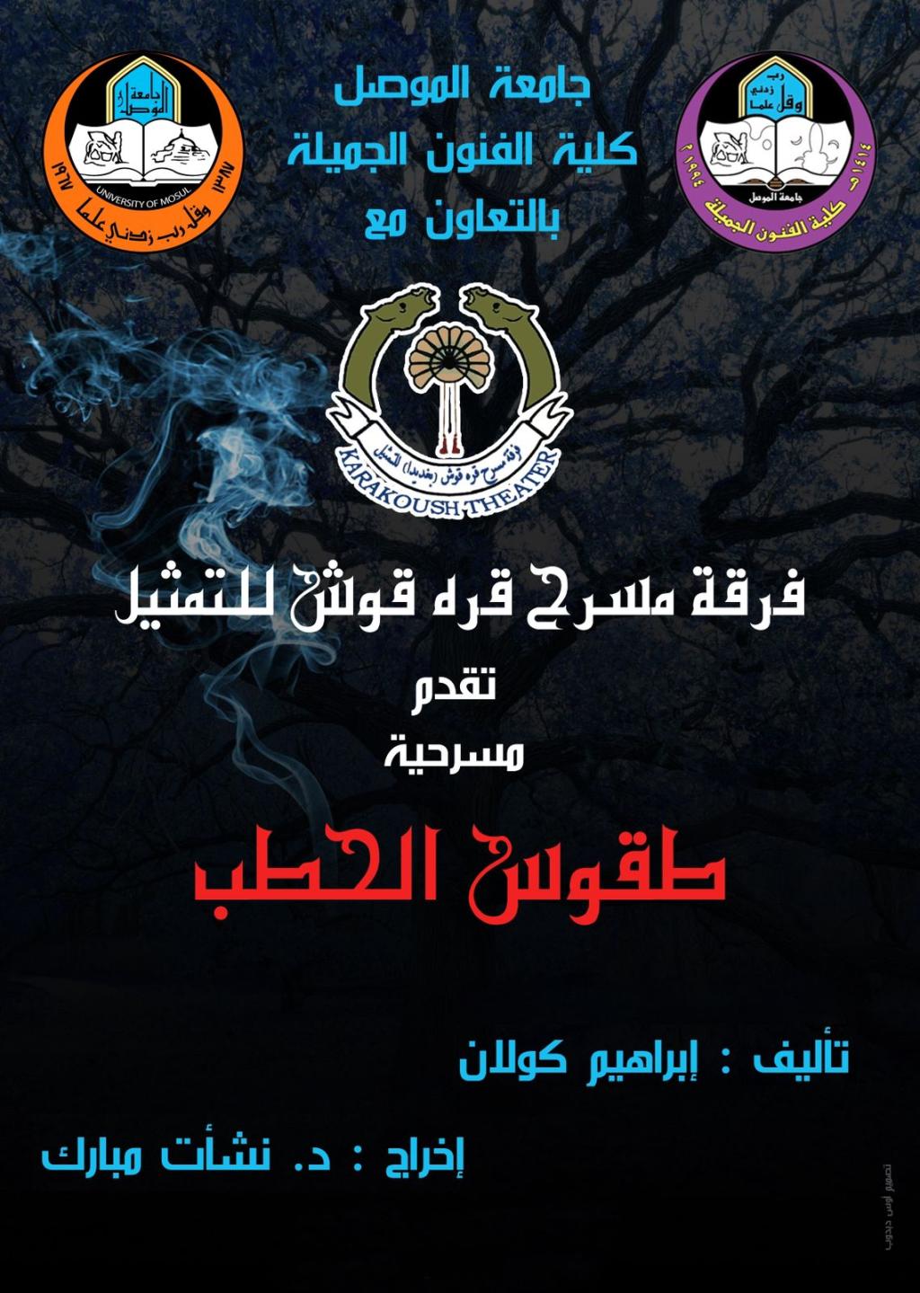 ان مسرحية طقوس الحطب هي من إنتاج جامعة الموصل وفرقة مسرح قره قوش للتمثيل، قام بأداء ادوارها أساتذة الكلية، وفي تمثيل المجاميع اشترك فناني الكلية ومسرح قره قوش من الشباب.