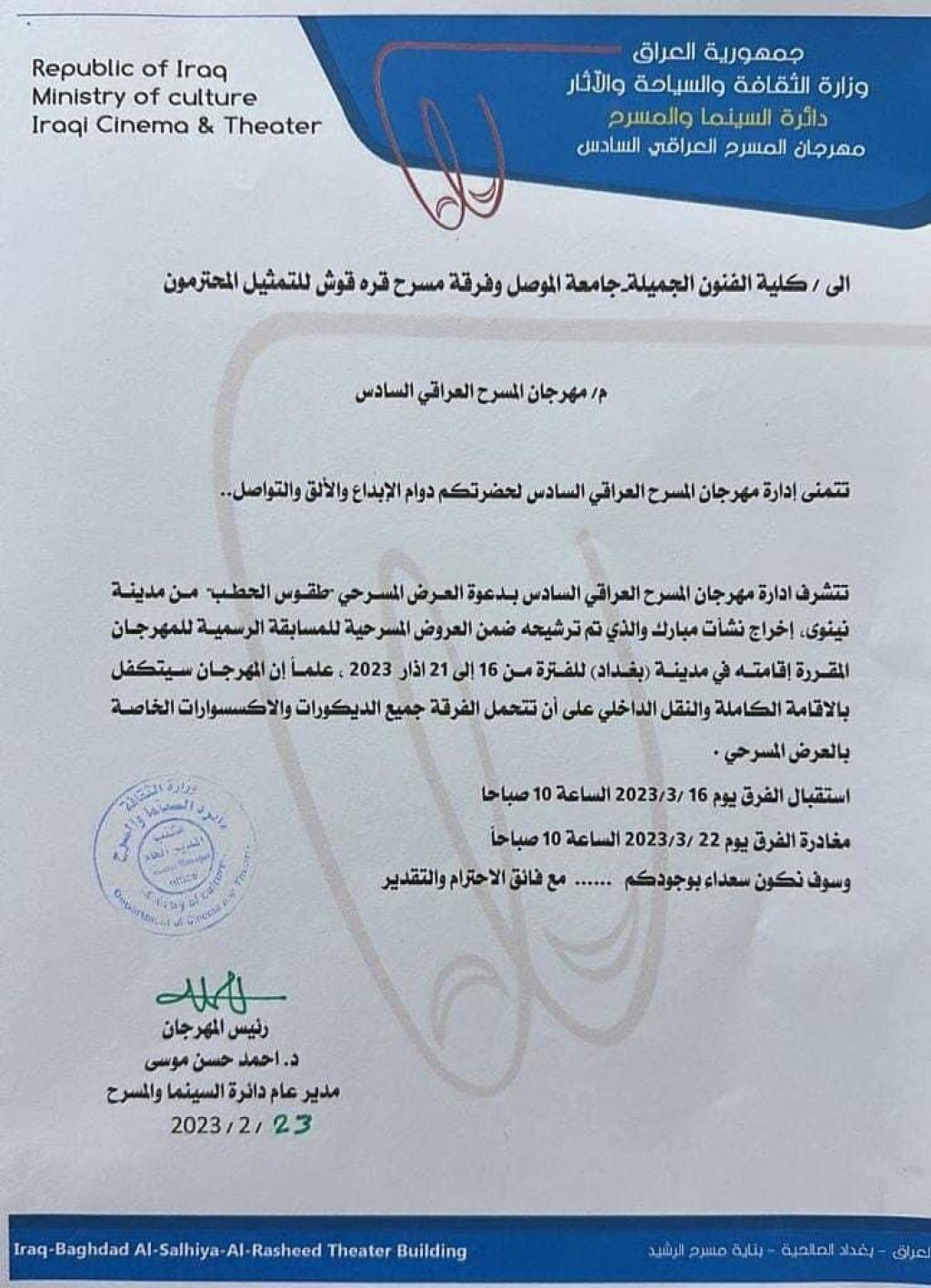 تشارك جامعة الموصل ومن خلال كلية الفنون الجميلة أعمال مهرجان المسرح العراقي بدورته السادسة الذي سيقام في ١٦ _٢١ آذار ٢٠٢٣.