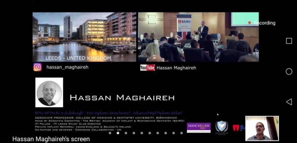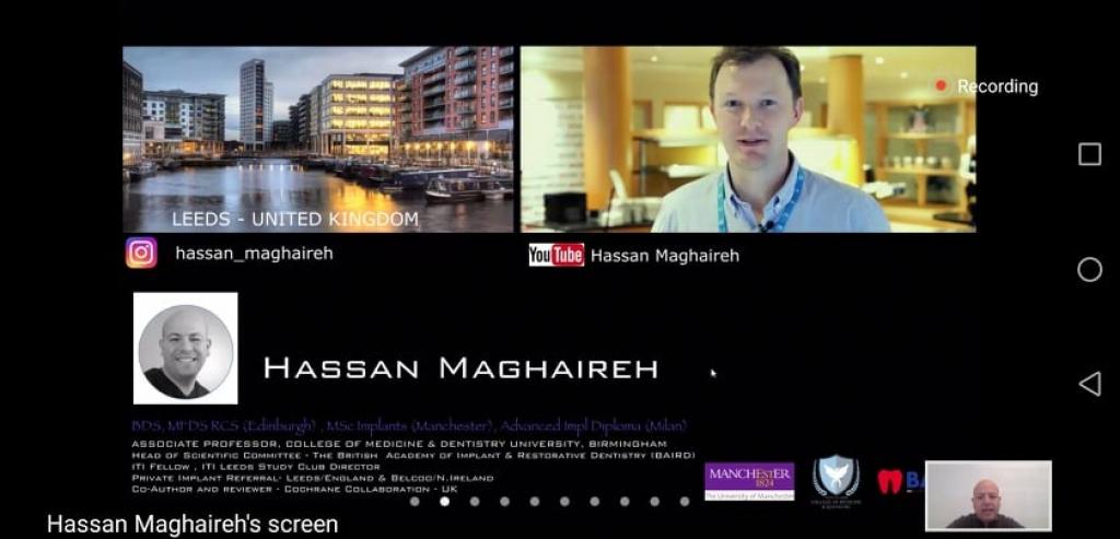 استضافت الكلية مساء يوم الجمعة الموافق 5/حزيران/٢٠٢٠ الدكتور حسان المغيرة (اختصاص الجراحة و زراعة الأسنان في كلية الطب و طب الأسنان في جامعة برمنغهام/ انكلترا وزميل التدريس السريري في زراعة الأسنان / جامعة مانشستر، في محاضرة (ويبينار) بعنوان : التعامل مع زراعة الأسنان في المنطقة الجمالية، حضرها عدد كبير من الهيئات التدريسية لكليات طب الأسنان في العراق و أطباء الأسنان من المحافظة و العراق ودول اخرى.