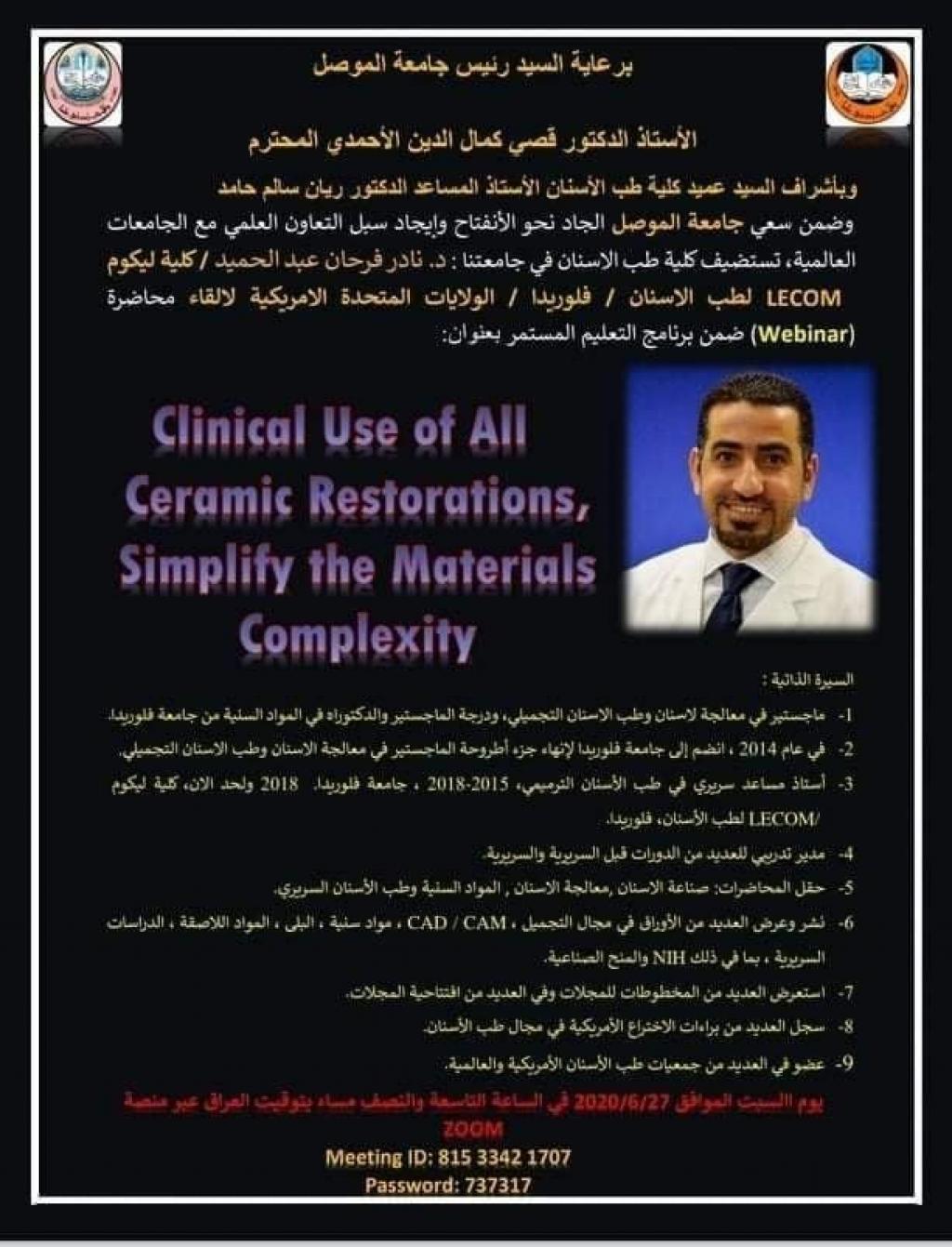 الاستخدامات السريرية لمادة السيراميك؛ شرح تبيسطي لهذه المادة المعقدة، و ذلك يوم السبت ٢٧/ حزيران /٢٠٢٠ الساعة التاسعة و النصف مساء ، عبر الفضاء الالكتروني وعلى منصة ZOOM.