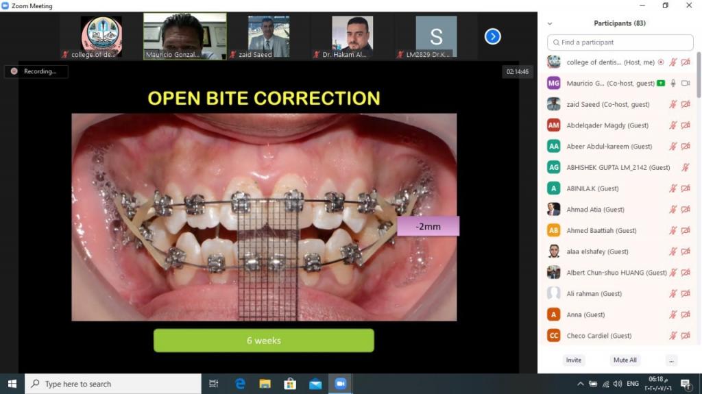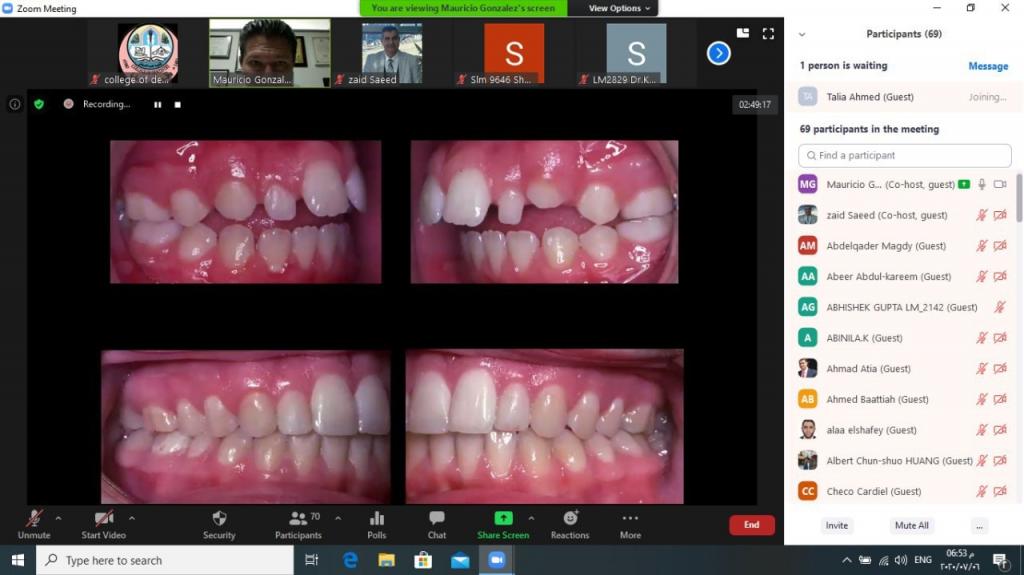 اقامت كلية طب الاسنان في جامعة الموصل محاضرة علمية عن تقويم الاسنان استضافت فيها الدكتور)موريشو كونزالز ) اختصاصي التقويم وخريج جامعة لاماليندا في الولايات المتحدة الامريكية من المكسيك ، على منصة زووم وعبر شبكة الإنترنت ، بعنوان(العلاج التقويمي والعظمي والجراحي للدغات المفتوحة) ، يوم الاثنين الموافق ٦/ تموز/ 2020، حضرها طلبة الدراسات العليا واختصاصي تقويم الاسنان من العراق و الدول العالمية.