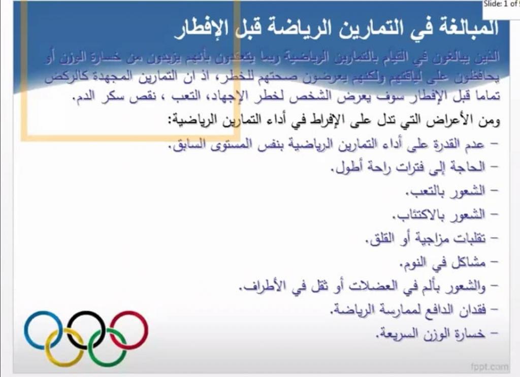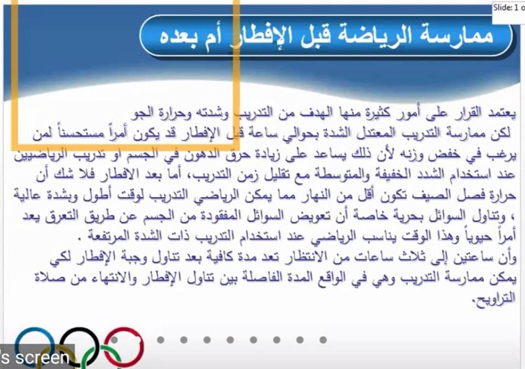 القى خلالها اساتذة متخصصون من كلية التربية البدنية وعلوم الرياضة محاضرات ، تطرقت الى أهم أنواع الحمية التي يمكن اتباعها في شهر رمضان مثل حمية الكيتو و قليلة الكربوهيدرات، وإلى أوقات و كيفية ممارسة الرياضة و التوصيات المهمة في هذا الشأن.