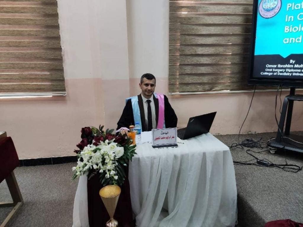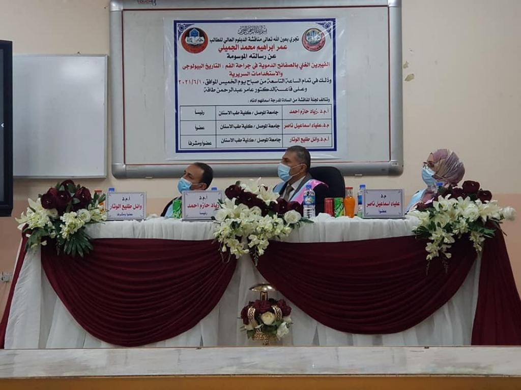ناقشت كلية طب الاسنان في جامعة الموصل بحث الدبلوم العالي المكتبي في جراحة الفم و الأسنان تحت عنوان : (الفيبرين الغني بالصفيحات الدموية في جراحة الفم والأسنان: التأريخ البايولوجي و الاستخدامات السريرية) ، يوم الخميس 10 حزيران 2021، في قاعة الاستاذ الدكتور عامر عبد الرحمن طاقة .