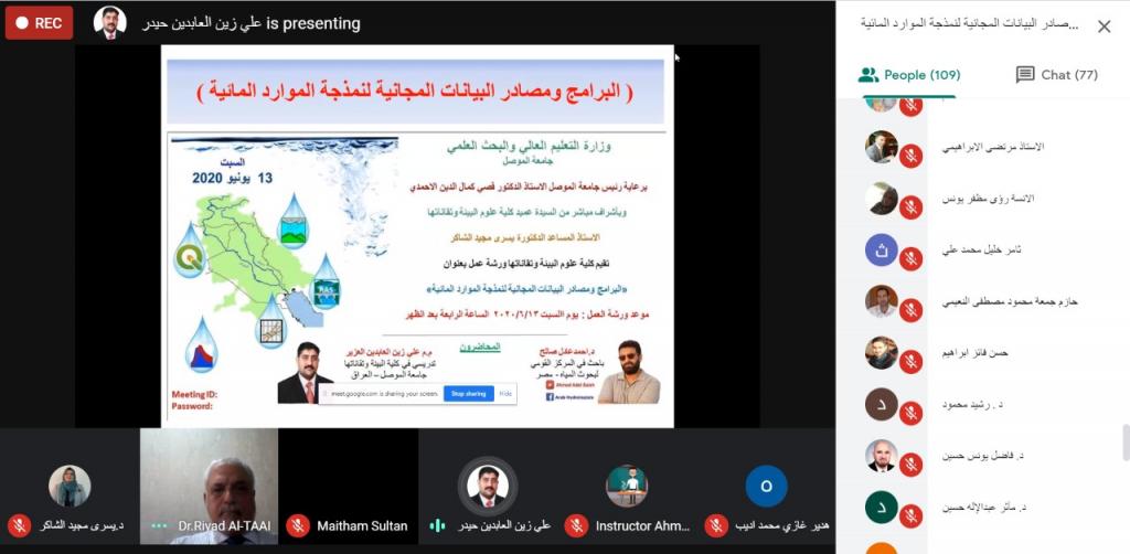 برعاية الاستاذ الدكتور قصي كمال الدين الاحمدي رئيس جامعة الموصل, وباشراف الاستاذ المساعد الدكتورة يسرى مجيد الشاكر عميد كلية علوم البيئة وتقاناتها، اقام قسم تقانات البيئة ، ورشة عمل بعنوان ( البرامج ومصادر البيانات المجانية لنمذجة الموارد المائية)، عبر الفضاء الالكتروني ، بحضور اساتذة من الكلية والجامعات العراقية والعربية .