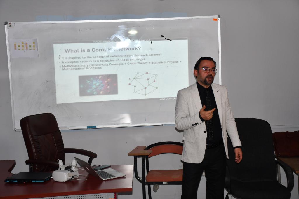 القى محاضراتها التدريسي الاستاذ المساعد الدكتور باسم محمد محمود،تناولت الورشة الشبكات المعقدة التي تعد من المجالات الحديثة في علم الشبكات في تخصص علوم الحاسوب، وتمثل تكاملاً بين عدة مفاهيم الشبكات (التشبيك) ومفاهيم علم البيانات ونظرية المخطط ومفاهيم علم الإحصاء إضافة الى أخرى مستوحاة من الفيزياء والإحصاء الميكانيكي، كما أنه يمكن أن يستخدم في العديد من التطبيقات سواء في علوم الحاسوب او غيرها من التخصصات،
