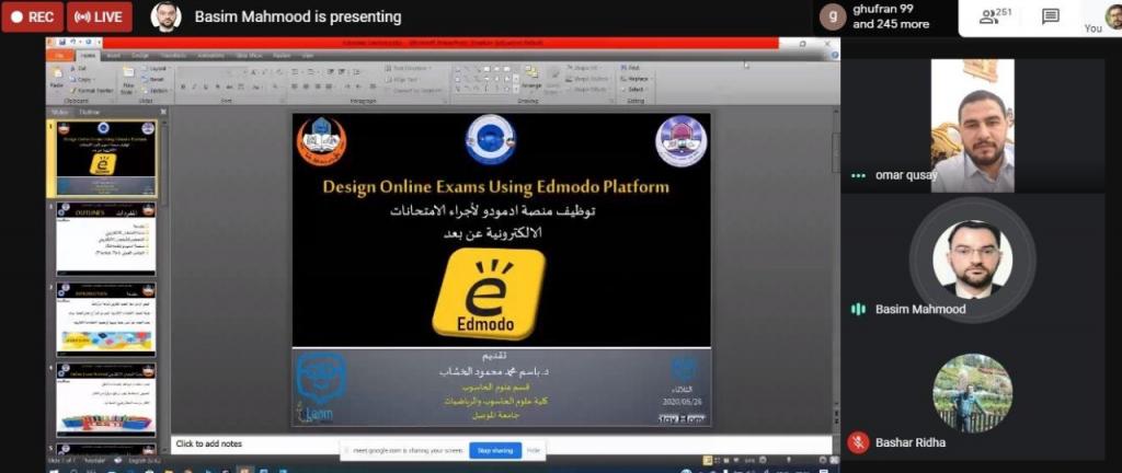 اقامت كلية علوم الحاسوب والرياضيات في جامعة الموصل الدورة التدريبية الالكترونية الموسومة ،”توظيف منصة Edmodo لإجراء الامتحانات الالكترونية عن بعد” ، عبر الفضاء الالكتروني. حضرها اساتذة وطلبة من الكلية والجامعة .