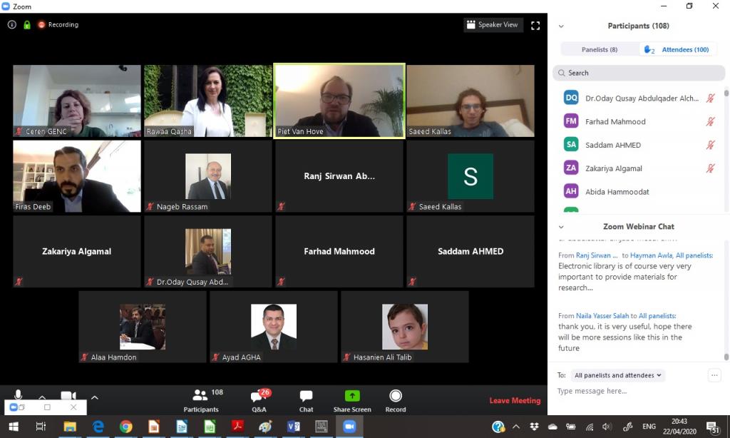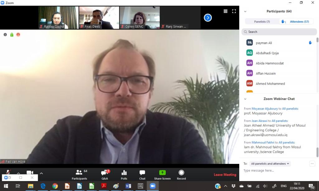 نظم قسم البعثات والعلاقات الثقافية بالتعاون مع منظمة سبارك الهولندية محاضرة دولية الكترونية بعنوان )استجابات الجامعات لوباء (COVID-19(Universities’ responses to the COVID-19 pandemic)شارك في المحاضرة تدريسين من جامعتي الموصل واربيل التقنية وعدة جامعات عراقية .القى خلالها السيد بييت فان هوف من جامعة انتويرب البلجيكية وبمشاركة عدد من اعضاء منظمة سبارك محاضرة تضمنت الاستراتيجيات التي تتبعها الجامعات العالمية في التعليم الالكتروني خلال جائحة كورونا الحالية وابرز التحديات التي تواجهها وما هي افضل الطرق المستخدمة في التعليم الالكتروني لغرض جذب الطلبة و تقبلهم لهذا النوع الجديد من التعليم.