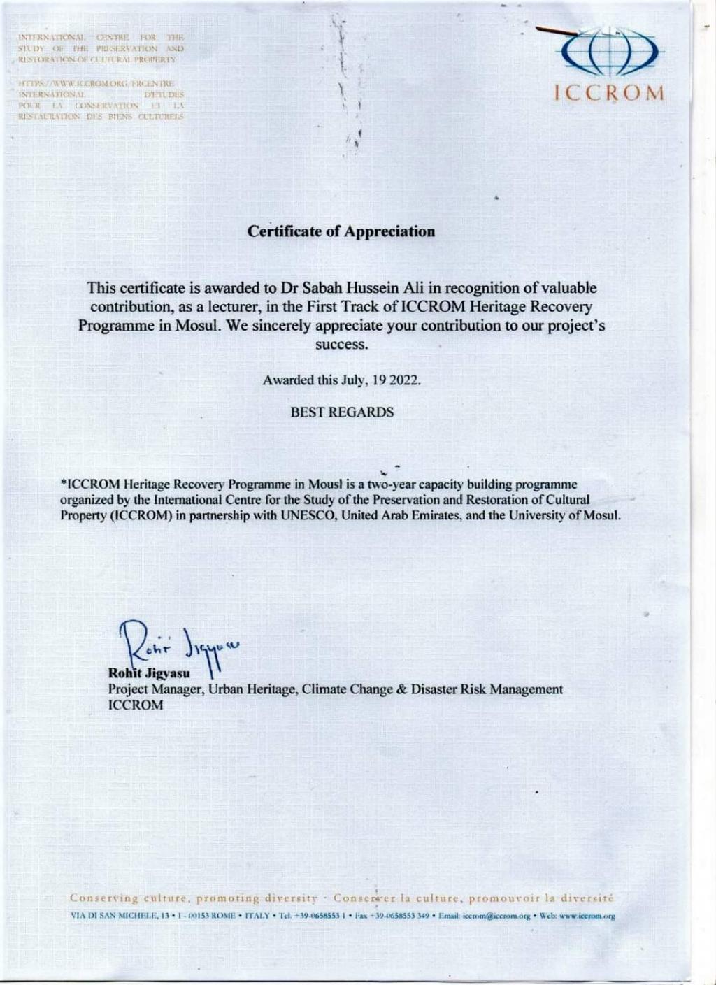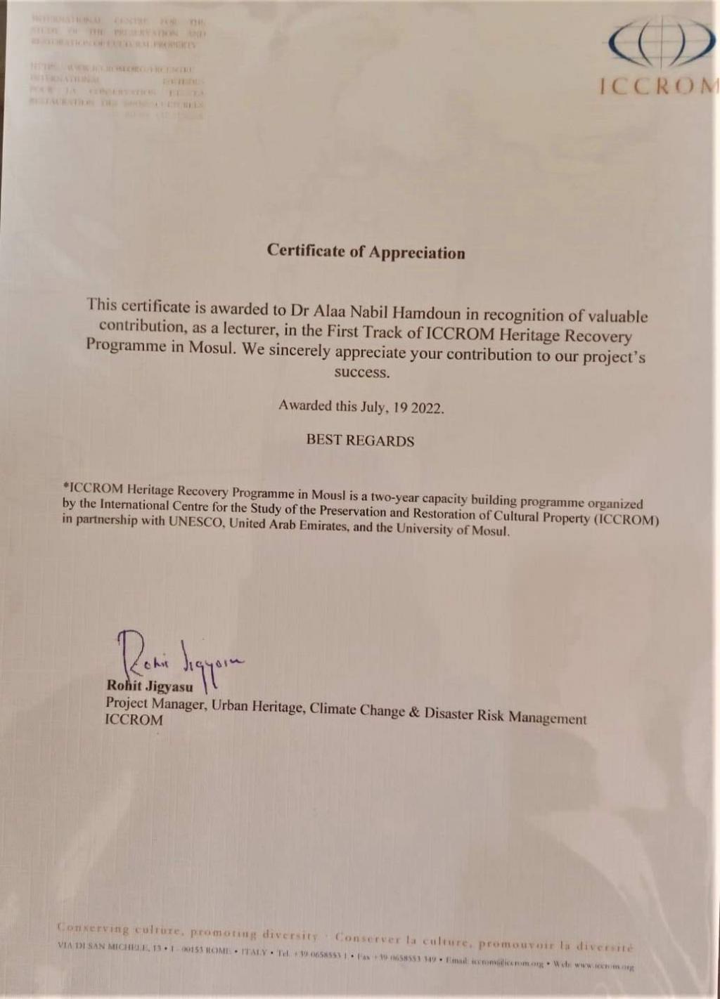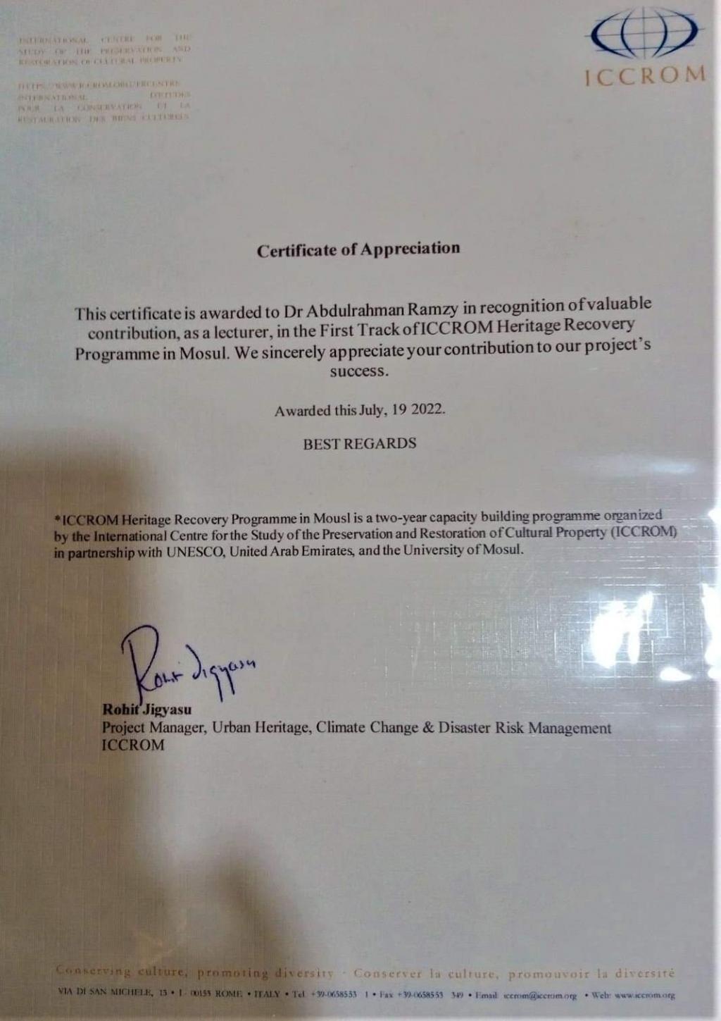 حصل مركز التحسس النائي بجامعة الموصل على شهادات تقديرية من المركز العالمي لدراسة وصيانة وترميم التراث الثقافي( الايكوروم ICCROM) لإسهام كوكبة من أساتذته في تدريب والقاء محاضرات ضمن هذا البرنامج العالمي والذي تم بالتعاون مع منظمة اليونسكو العالمية وجامعة الموصل.يذكر ان هذا البرنامج مخصص لتدريب مجموعة من المهندسين المعماريين والمدنيين وتهيئتهم للعمل في إعادة إعمار واحياء المباني التراثية المتضررة في مدينة الموصل القديمة،هذا وقد استضاف مركز التحسس النائي المسار الثاني للبرنامج والذي استغرق أربعة أسابيع في قاعات المركز.شارك في التدريب والقاء المحاضرات كل من مدير المركز الاستاذ المساعد الدكتور علاء نبيل حمدون والاستاذ صباح حسين علي والأستاذ المساعد الدكتور رشيد سليم عبد والأستاذ المساعد الدكتور عبدالرحمن رمزي قبع.
