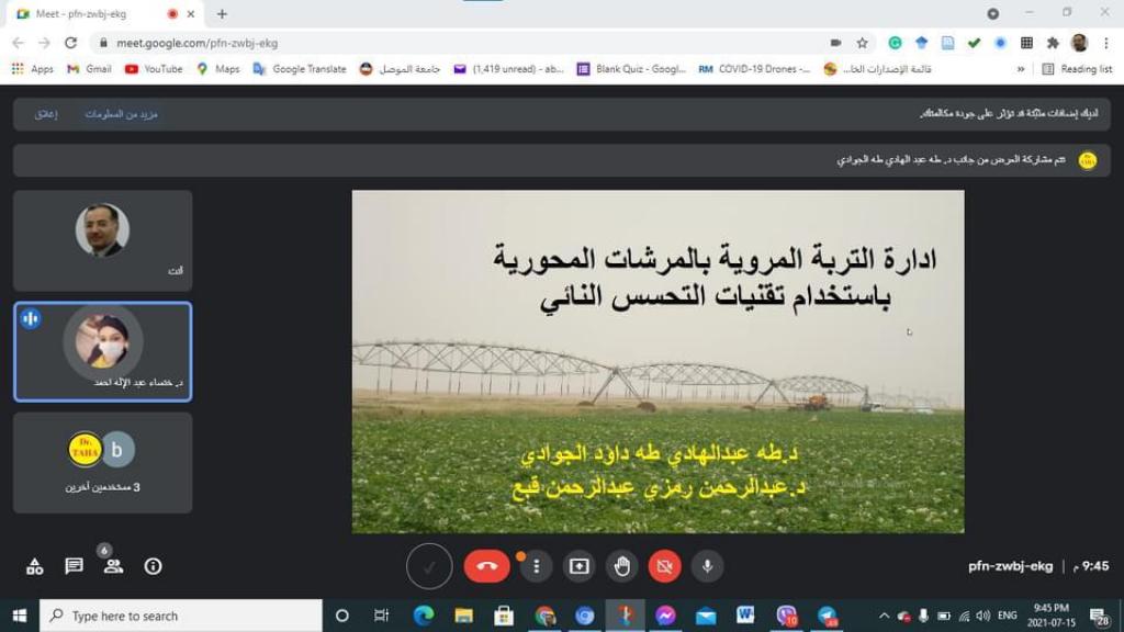 اقام مركز التحسس النائي بجامعة الموصل حلقة نقاشية بعنوان ( ادارة الترب المروية بالمرشات المحورية باستخدام تقنيات التحسس النائي) يوم الخميس 15 تموز2021 .قدم محاضرات الحلقة النقاشية الدكتور طه عبدالهادي طه الجواديتناولت الحلقة مناقشة اهمية استخدام المرشات المحورية في الزراعة لما لها من اهمية كبيرة في تقليل استخدام المياه بنسبة تصل الى 50% مقارنة بطرق السقي المعمول بها خصوصا في موسمنا الحالي الذي يعتبر موسم جفاف لقلة الامطار ، وكذلك مراقبة استخدام هذه المرشات لمنطقتين مختلفتين باستخدام المرئيات الفضائية وبرامجيات التحسس النائي ولفترتين زمنيتين مختلفتين.تضمنت الحلقة النقاشية توصيات لادارة التربة والزراعة باستخدام هذه المرشات المحورية وضرورة استخدامها في كافة المناطق لفوائدها العديدة في تقليل صرف المياه وفي امكانية استغلال الارض لاكثر من دورة زراعية واحدة.شهدت الحلقة الكثير من النقاشات العلمية من قبل الباحثين والتدريسيين الحاضرين حول توظيف مثل هذه النتائج واستخدام مثل هذه التقنيات في المحافظة بعد توفير الدعم اللازم لتشغيلها.