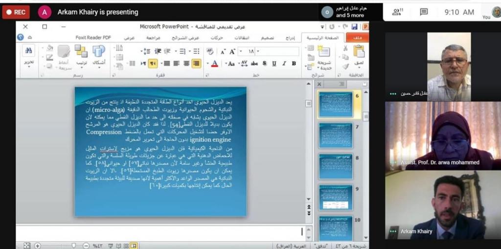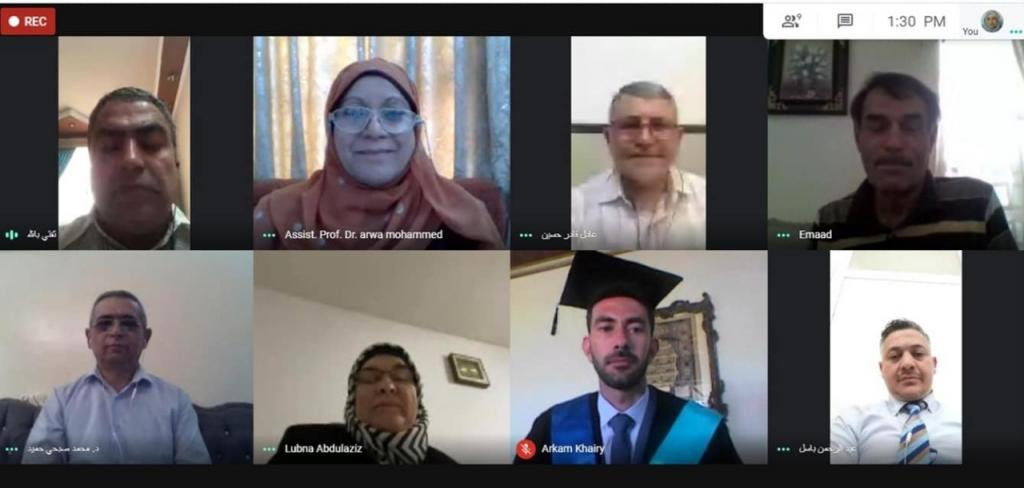 جرت المناقشة صباح يوم الخميس الموافق 4 حزيران 2020 ، وبحضور السيدة عميد كلية العلوم الاستاذ المساعد الدكتورة هيام عادل ابراهيم الطائي ، والسيد معاون العميد للشؤون العلمية د. محمد صبحي حميد.