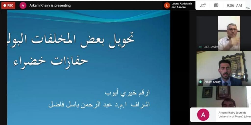 نوقشت في جامعة الموصل أطروحة دكتوراه للطالب (أرقم خيري أيوب فتحي) من كلية العلوم / قسم الكيمياء/ اختصاص الكيمياء الصناعية الموسومة (تحويل بعض المخلفات البوليميرية إلى حفازات خضراء)، عبر الفضاء الالكتروني ، وبإشراف الاستاذ المساعد الدكتور عبد الرحمن باسل فاضل أمين.