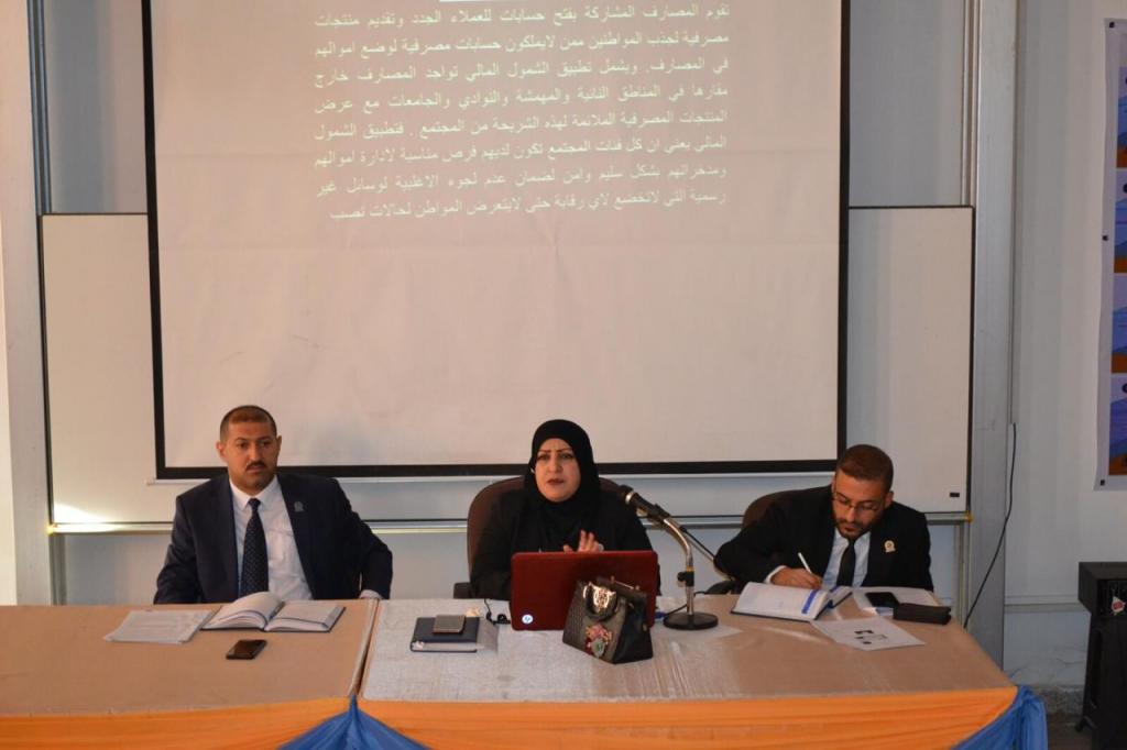 اقام البنك المركزي العراقي ندوة لمناقشة الشؤون المالية تحت عنوان (الشمول المالي والمصرفي) يوم الثلاثاء الموافق ٢٦/١١/٢٠١٩ على رحاب قاعة الفرات في قسم هندسة السدود والموارد المائية في تمام الساعة التاسعة صباحا. حضر الندوة معاون عميد كلية الهندسة للشؤون العلمية د. عمر موفق محمود اليوسف (ممثلا عن عميد كلية الهندسة) والسيد المعاون الاداري رعد صالح سلطان ومجموعة من منتسبي كلية الهندسة. تضمنت الندوة تعريف مفصل لآلية الشمول المالي والمصرفي ومسالة توطين رواتب موظفي الدولي واهمية هذه الامور في الحفاظ على ديمومة تسليم الرواتب للموظفين حتى في حالة حدوث امور طارئة او نشوب حروب وغيرها. كما تضمنت الندوة توضيح الية سحب الاموال من الصراف الالي في حال جهوزيته وغيرها من الامور الاخرى. قام بإلقاء هذه الندوة كل من السيدة ميسون محمد طلب مديرة قسم المدفوعات والسيد علي عز الدين ذنون مدير الاعلام والعلاقات العامة والسيد الارقم خير الدين صبري من فريق الشمول المالي. كما تخللت الندوة العديد من الاستفسارات والنقاشات بين الحاضرين واللجنة المكلفة بإلقاء المحاضرات. انتهت فعاليات الندوة في تمام الساعة الحادية عشر صباحا.