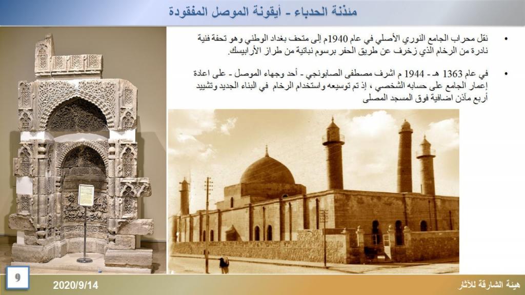 قدم خلالها محاضرة تفاعلية بعنوان ” مئذنة الحدباء أيقونة الموصل المفقودة” تضمنت التعريف بأهمية المئذنة الحدباء كمعلم متفرد ينتمي إلى العمارة الإسلامية، واستعراض لمحة تاريخية عنها وعرض أهم أعمال الترميم والحماية التي اجريت عليها خلال فترات مختلفة.