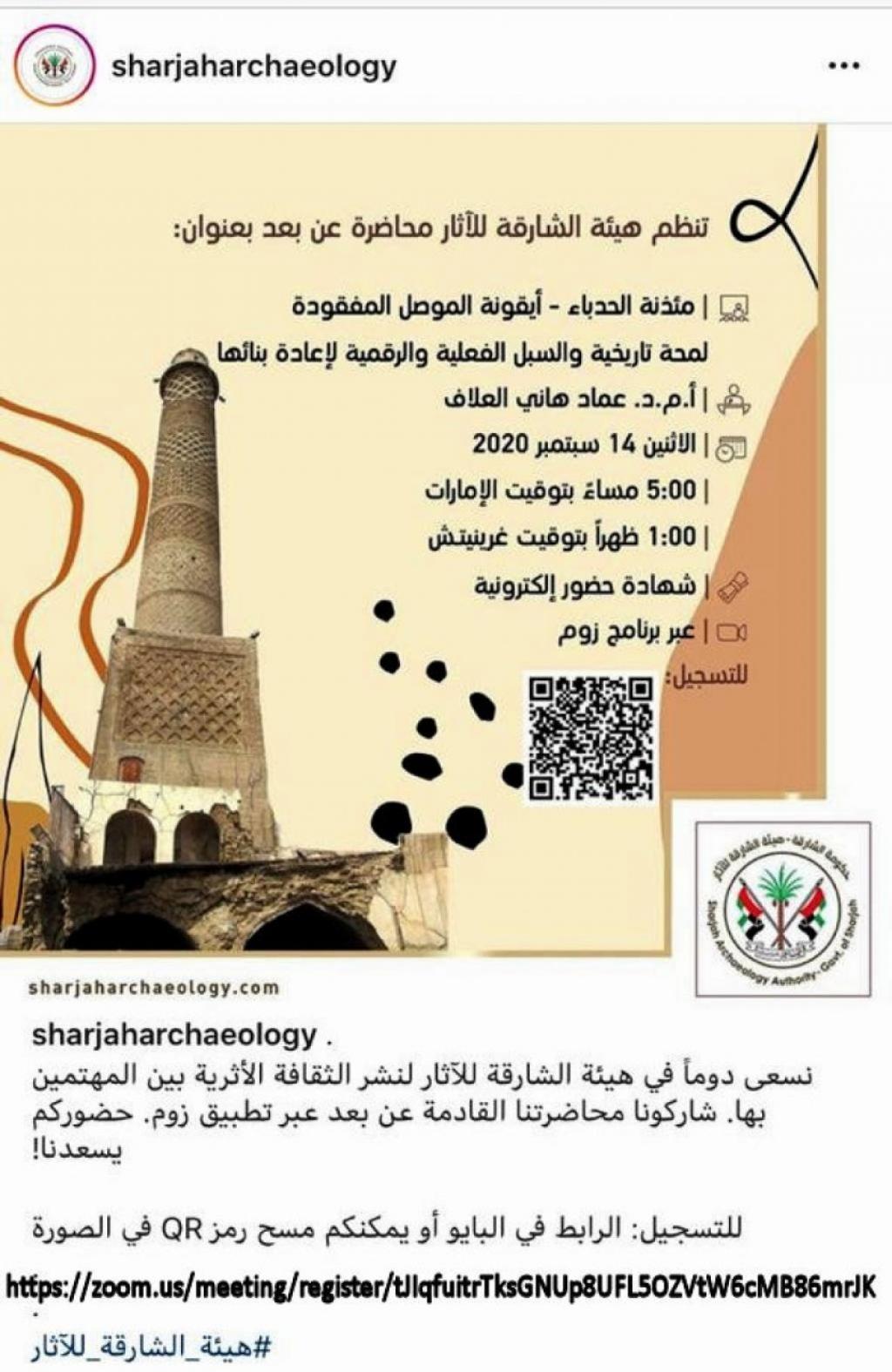 استضافت هيئة الشارقة للآثار الأستاذ المساعد الدكتور عماد هاني العلاف التدريسي في كلية الهندسة بجامعة الموصل عبر الفضاء الالكتروني ، يوم الاثنين الموافق 14/ايلول/2020. حضرها عدد من المختصين واصحاب العلاقة بحقول الهندسة والآثار ومن مختلف الدول العربية.