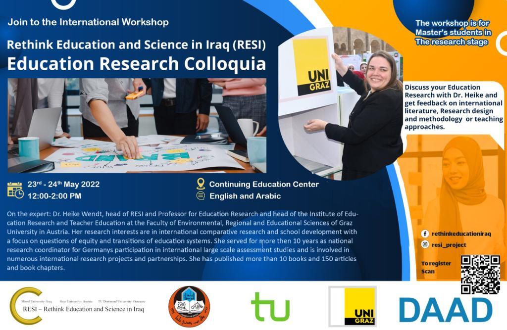 تقيم جامعة الموصل / قسم البعثات والعلاقات الثقافية – وحدة الركن الاماني ، ورشة عمل دولية للبروفسور الدكتورة هايك وندت من جامعة كراز تحت عنوان اعادة التفكير في التعليم والعلوم في العراق . يومي 23 و 24 ايار 2022 ، وفي قاعة مركز التعليم المستمر في الجامعة .
