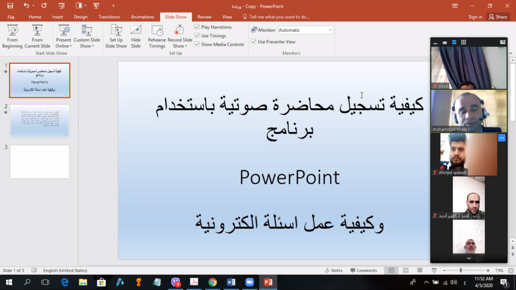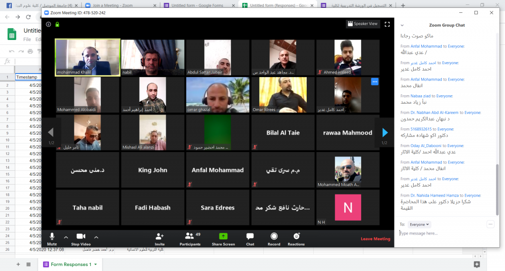 تنفيذا لتوجيهات السيد رئيس جامعة الموصل الاستاذ الدكتور قصي كمال الدين الاحمدي المحترم بضروة ديمومة التواصل العلمي الالكتروني وبتوجيه مباشر من السيدة عميد الكلية أ.م.د. يسرى مجيد الشاكر اقامت كلية علوم البيئة وتقاناتها/قسم علوم البيئة ورشة عمل حول “كيفية تسجيل محاضرة صوتية باستخدام برنامج البوربوينت (PowerPoint) وكيفية عمل اسئلة الكترونية ” تضمنت الورشة شرح بطريقة مبسطة وكيفية حفظ المحاضرة الصوتية بشكل فيديو يُمكن التدريسي من تحميله على موقع Google Classroom.كذلك تضمنت كيفية عمل استمارة اختبار إلكترونية يكون تصحيح الإجابة إلكترونيا بحيث يطلع الطالب على نتيجة الاختبار مباشرة بعد انتهاء الاختبار وأيضا كيفية عمل رابط إلكتروني لاستمارة الاختبار وإرسالها إلى الطلاب عن طريق موقع Google Classroom القاها رئيس قسم علوم البيئة الاستاذ المساعد الدكتور محمد ابراهيم خليل وذلك عبر برنامج الالكتروني ZOOM والتي اقيمت اليوم الاحد المصادف 4/5/2020 وبمشاركة واسعة ومن مختلف الكليات والجامعاتحيث شارك في الورشة مجموعة من الاساتذة من جامعة ديالى و جامعة تكريت والجامعة التقنية الشمالية و كلية الحدباء الجامعة .