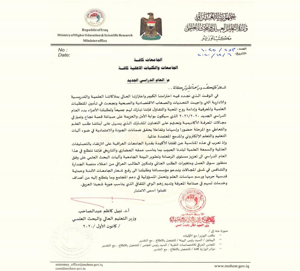 بارك وزير التعليم العالي والبحث العلمي الأستاذ الدكتور نبيل كاظم عبد الصاحب بدء العام الدراسي الجديد للسنة 2021/2020 داعيا في الوقت نفسه الجامعات الى تحمل مسؤوليتها في دعم المجتمع.وجاء في نص الكتاب الموجه الى الجامعات والكليات الحكومية والأهلية بمناسبة العام الدراسي الجديد أنه في الوقت الذي نجدد فيه احترامنا الكبير واعتزازنا العالي بملاكاتنا العلمية والتدريسية والإدارية التي واجهت التحديات والصعاب الاقتصادية والصحية ونجحت في تأمين المتطلبات العلمية والمعرفية وإدامة روح المحبة والتفاؤل فإننا نبارك لهم جميعا ولطلبتنا الأعزاء بدء العام الدراسي الجديد 2021/2020 الذي سيكون بوابة الأمل والعزيمة على صياغة قصة نجاح وتميز في مجالات المعرفة الأكاديمية ونحثهم على التعاون المشترك الذي يسهل على أبنائنا طلب العلم والتعاطي مع المرحلة حضورا وإسهاما وتفاعلا يحقق ضمانات الجودة والاعتمادية في ضوء آليات التعليم والتعلم الإلكتروني والمدمج المعتمدة عالميا.وإذ نعرب في هذه المناسبة عن ثقتنا الأكيدة بقدرة الجامعات العراقية على الارتقاء بالتصنيفات العالمية والسمعة العلمية لبلدنا الحبيب بما يناسب عمقه الحضاري والتاريخي فإننا نتطلع في هذا العام الدراسي الى تعزيز مستوى الرصانة وتطوير البيئة الجامعية وآليات البحث العلمي على وفق منظور سوق العمل ومتغيرات الطلب العالمي وتمكين الطالب العراقي من اعتلاء منصة الجدارة والتنافس في شتى المجالات وندعو مؤسساتنا وطلبتنا الى رفع شعار الجامعات الآمنة وحماية قدسية حرمها ورسم سياسات العلم وتحمل المسؤولية في دعم المجتمع وما يتطلع إليه من أهداف وخدمات تسهم في صناعة المعرفة وتديم زخم الوعي الثقافي الذي يناسب هوية شعبنا العريق.دائرة العلاقات والاعلام