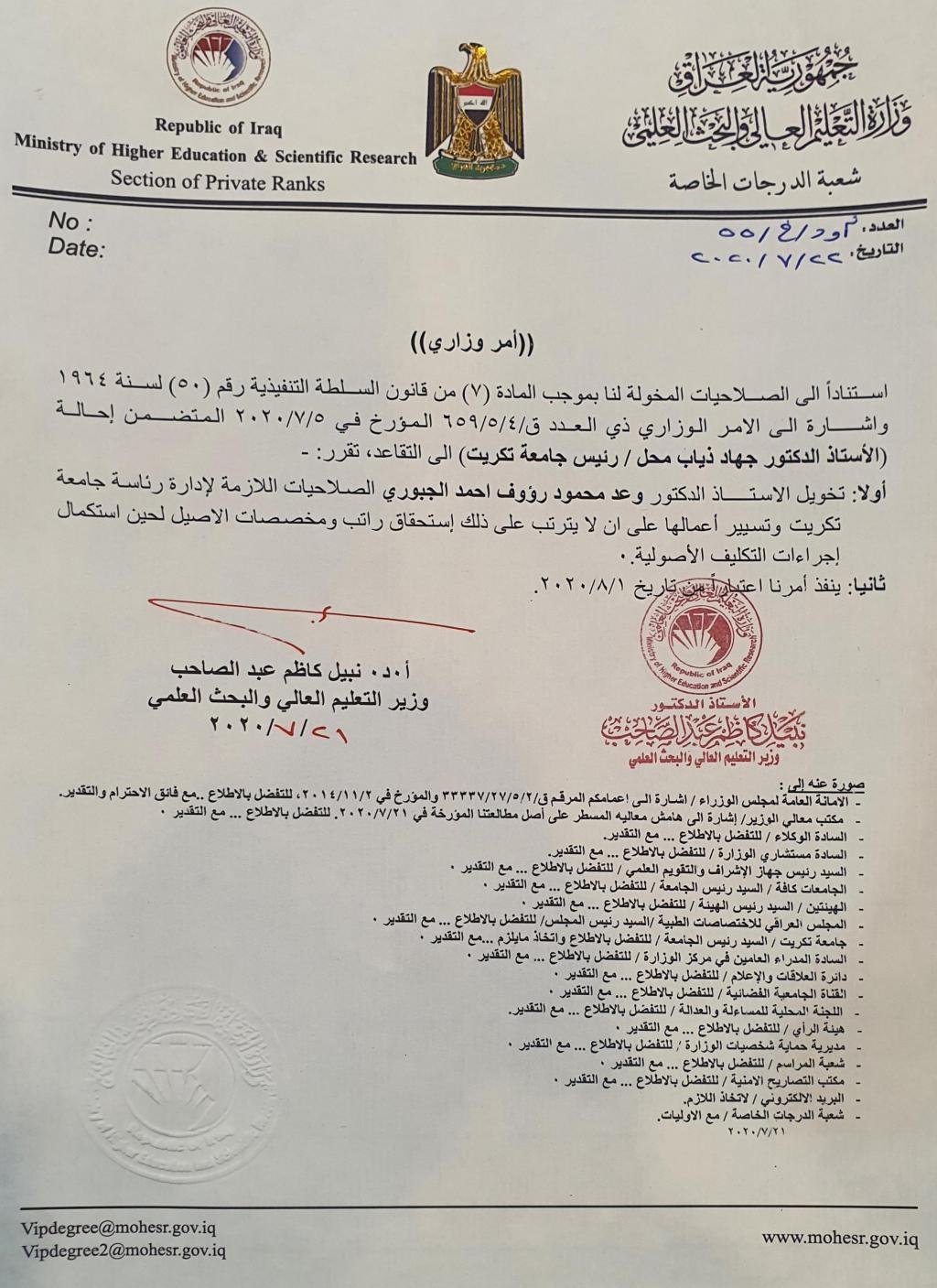 وزير التعليم يكلف رئيسا جديدا لجامعة تكريت