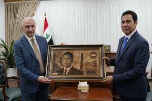 وفي ختام اللقاء، قدّم رئيس جامعة الموصل هدية رمزية من إعداد قسم النشاطات الفنية في الجامعة، تعبيرًا عن التقدير لجهود السيد المحافظ في ملف إعادة الإعمار وما تشهده المحافظة من نهضة خدمية وتنموية.