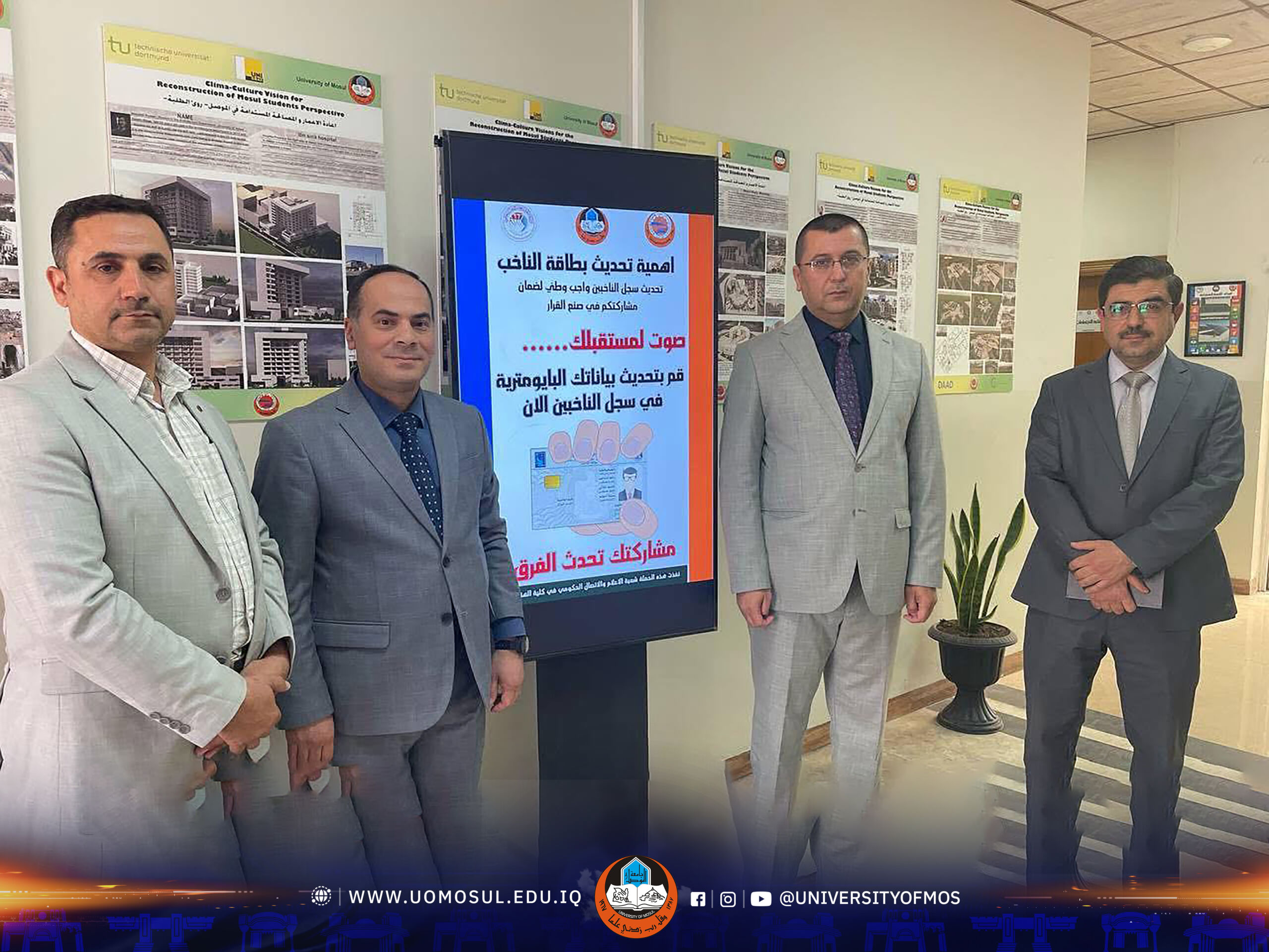 ضمن جهود تحقيق أهداف التنمية المستدامة، ولا سيما الهدف السادس عشر المتعلق بالسلام والعدل والمؤسسات القوية، نظمت كلية الهندسة في جامعة الموصل حملة توعوية بعنوان ( أهمية تحديث بطاقة الناخب ) ، يوم الأربعاء 21 أيار 2025 .