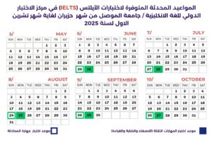 مركز الإختبار الدولي للغة الإنكليزية IELTS في جامعة الموصل يعلن عن مواعيد الاختبارات المتوفرة من شهر حزيران ولغاية تشرين الأول ٢٠٢٥ .