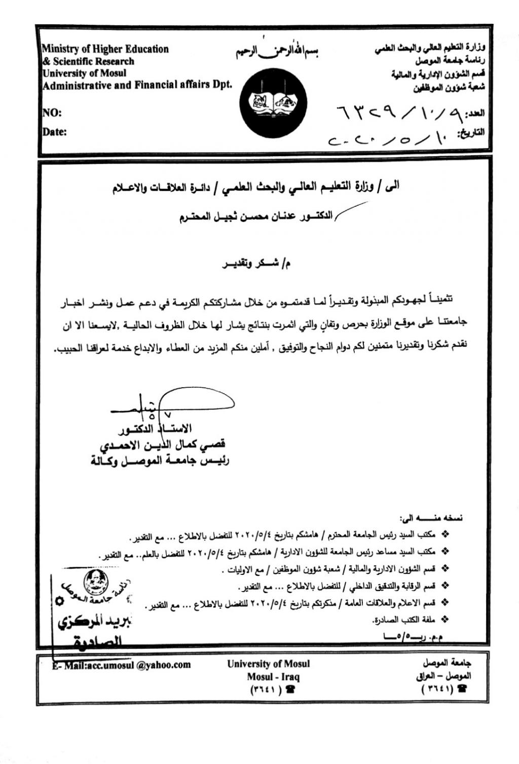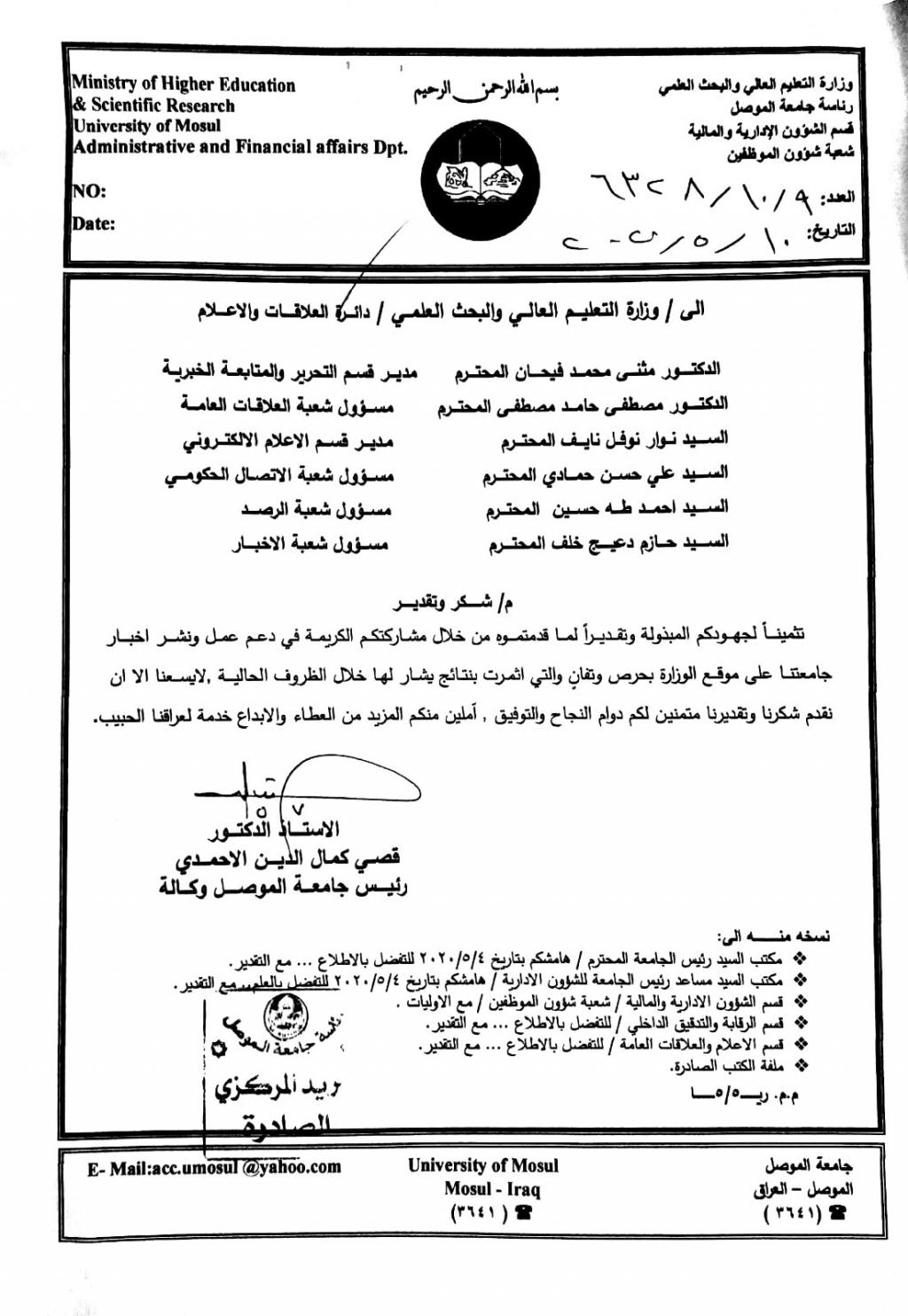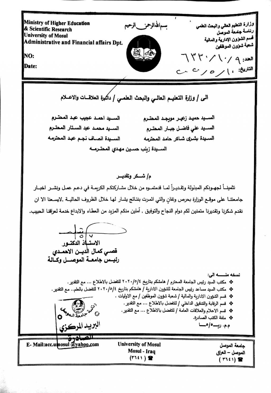 جامعة الموصل تثمن دور دائرة العلاقات والاعلام في الوزارة
