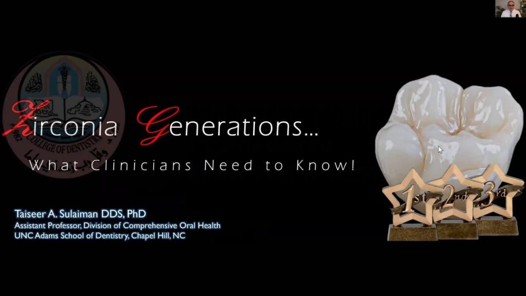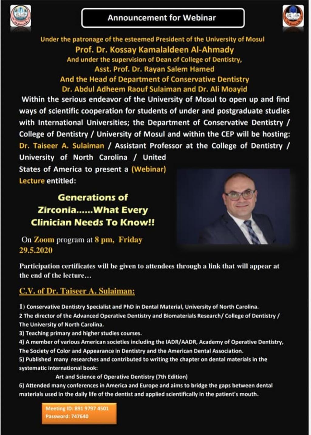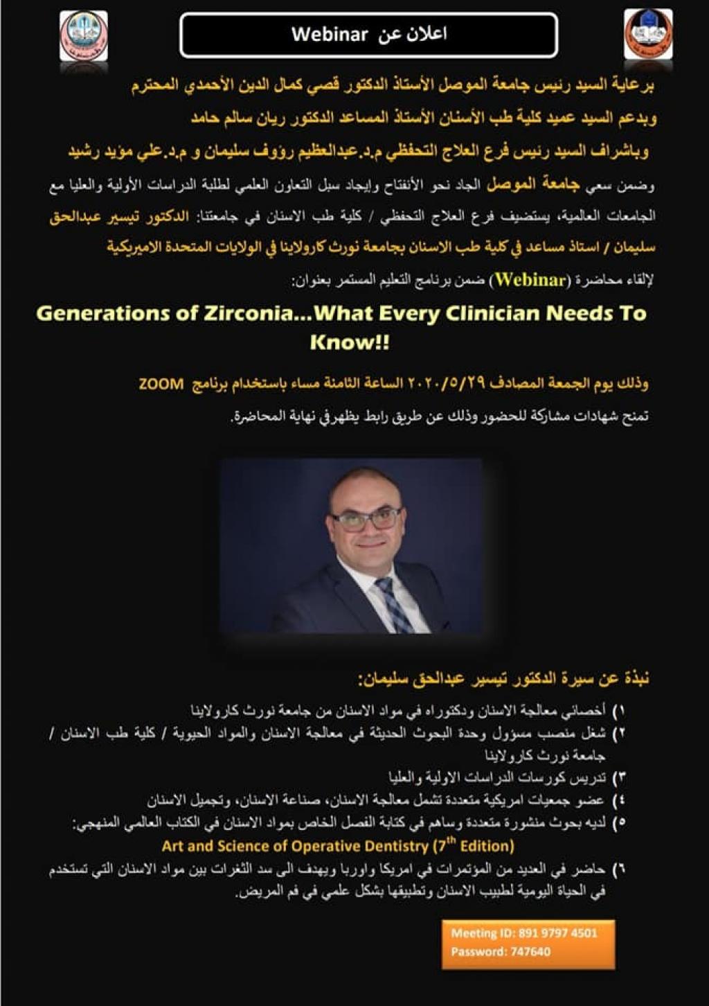 برعاية الاستاذ الدكتور قصي كمال الدين الأحمدي رئيس جامعة الموصل و بإشراف الاستاذ المساعد الدكتور ريان سالم حامد عميد كلية طب الأسنان ، وضمن سعي الجامعة نحو الانفتاح و إيجاد سبل التعاون العلمي مع الجامعات العالمية، استضاف فرع العلاج التحفظي بكلية طب الاسنان في جامعة الموصل الدكتور تيسير عبد الحق سليمان الأستاذ المساعد في كلية طب الأسنان بجامعة نورث كارولاينا في الولايات المتحدة الاميريكية لإلقاء محاضرة (ويبينار) تحت عنوان: ( أجيال الزركونا، ما يجب على كل طبيب معرفته!) (Zirconia Generations …What Clinicians Need To Know) ، مساء يوم الجمعة الموافق 29 ايار 2020، عبر برنامج زوم، حضرها عميد الكلية ، وعمداء كليات طب الاسنان في جامعات (التراث ، ابن سينا ، كركوك وكلية النور الجامعة) بالإضافة الى اساتذة واطباء اسنان من جامعة الموصل ومن مختلف كليات وجامعات العراق.