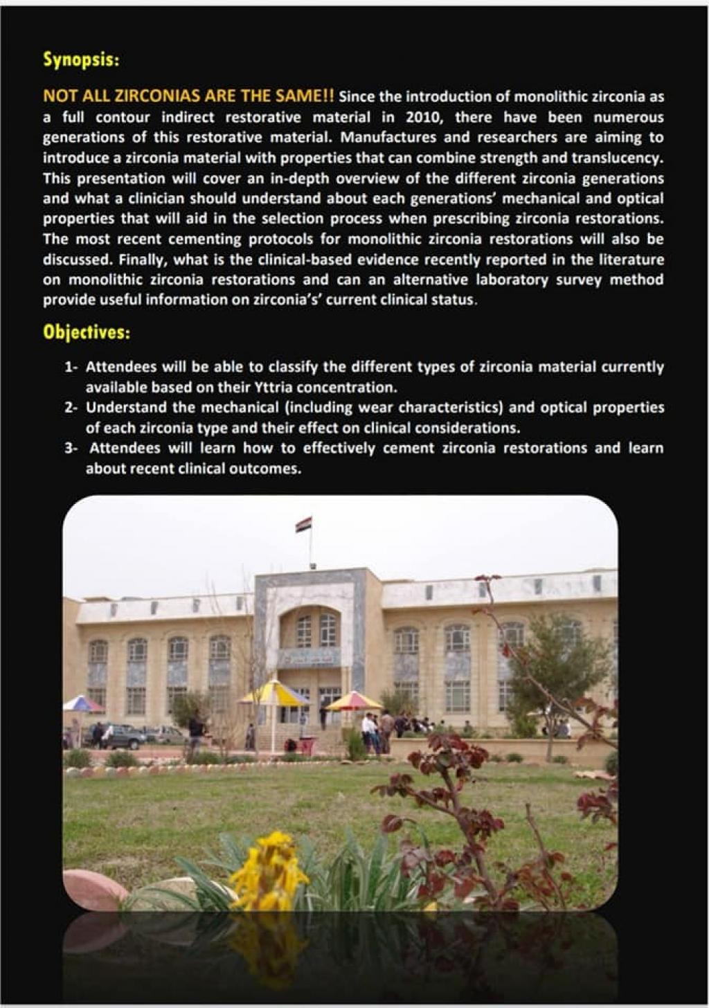 تم تنظيم هذه المحاضرة من قبل رئيس فرع العلاج التحفظي الدكتور عبد العظيم رؤوف سليمان ومقرر الفرع الدكتور علي مؤيد رشيد ، وتناولت شرح انواع مادة الزيركون المستخدمة لعمل التعويضات السنية وصفات كل منها واستخداماتها حسب الدراسات الحديثة..