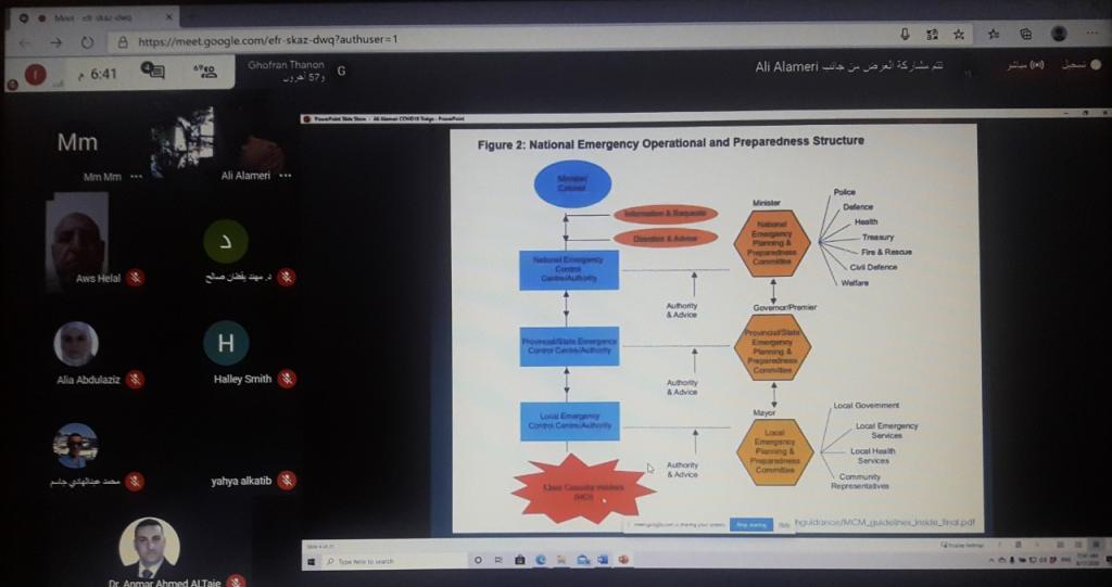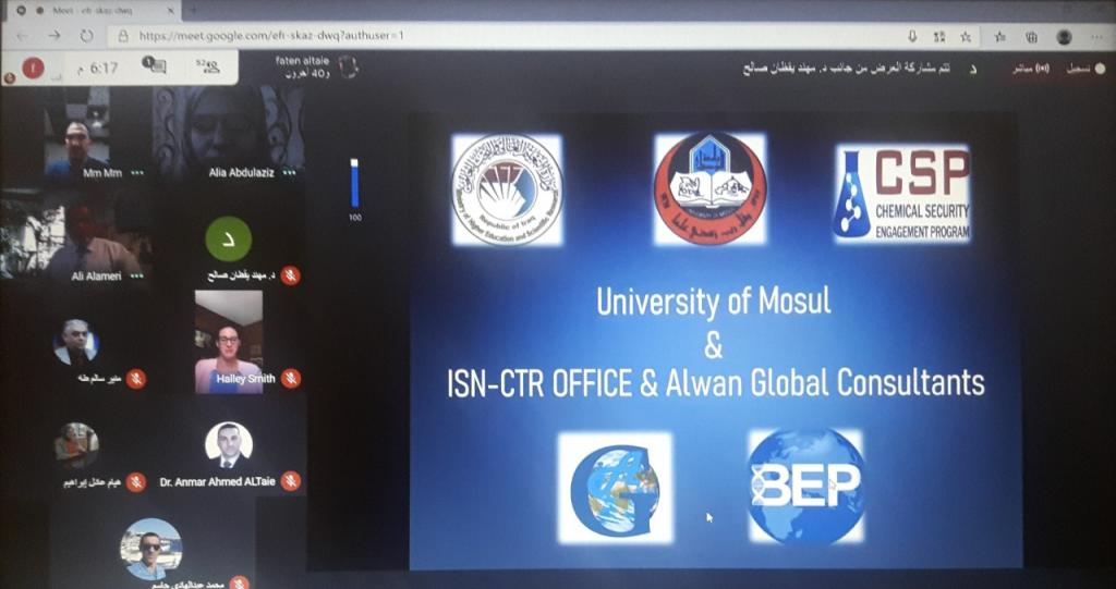 افتتحت في الساعة السادسة من مساء يوم الاثنين الموافق 17 اب 2020 اعمال حلقة نقاشية (WEBINAR) عبر الفضاء الالكتروني عن تطورات جائحة كوفيد 19 ، اقامتها جامعة الموصل حضرها السيد مساعد رئيس الجامعة للشؤون العلمية الاستاذ الدكتور منير سالم طه ممثلاً عن السيد رئيس الجامعة وعدد من عمداء الكليات واساتذة من جامعة الموصل والجامعات العراقية ووزارة التعليم العالي والبحث العلمي ومختصين من دوائر الصحة في المدينة ، ومن مكتب مكافحة المخاطر البايولوجية والكيميائية ( ISN-CTR) في وزارة الخارجية الامريكية السيدة هالي سميث والدكتور علي العامري مدير برامج الأمن والسلامة البيولوجية والكيميائية / واشنطن ، فضلا عن الاستاذ الدكتورة ناتاشا ك. جريفيث / مركز الاحتواء العالي خدمات البحوث الجامعية والإدارة مكتب السلامة البحثية جامعة جورجيا / ولاية جورجيا.جورجيا.