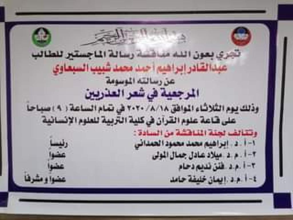 ناقشت كلية التربية للعلوم الانسانية رسالة ماجستير عن المرجعية في شعر العذريين. صباح يوم الثلاثاء الموافق ١٨ / آب / ٢٠٢٠ ، وعلى قاعة المناقشات في الكلية .