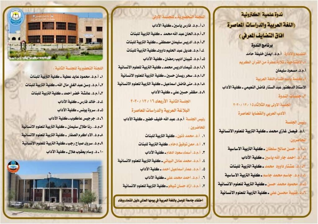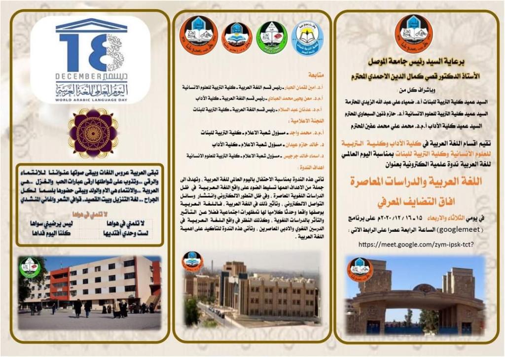 برعاية السيد رئيس جامعة الموصل الأستاذ الدكتور قصي كمال الدين الأحمدي ،وبإشراف كل من عميد كلية التربية للبنات الاستاذ الدكتورة ضمياء علي عبدالله، وعميد كلية التربية للعلوم الإنسانية الاستاذ الدكتور حازم ذنون، وعميد كلية الآداب الاستاذ المساعد الدكتور محمد علي عفين، اقامت أقسام اللغة العربية في هذه الكليات ندوة علمية الكترونية بعنوان (اللغة العربية والدراسات المعاصرة افاق التضايف المعرفي) بمناسبة اليوم العالمي للغة العربية استمرت اعمالها يومي الثلاثاء والاربعاء الموافقين لـ (١٥ – ١٦ كانون الأول ٢٠٢٠) ، عبر برنامج (google meet).هدفت الندوة الى تسليط الضوء على واقع اللغة العربية في ظل الدراسات اللغوية المعاصرة والتطور الالكتروني وانتشار وسائل تواصله ، وتأثير ذلك في اللغة العربية ، فاللغة العربية بوصفها واقعا وحدثا كلاميا لها تمظهرات اجتماعية فضلا عن التأثير والتأثر بالدراسات اللغوية والنظر في واقعها في الدرسين اللغوي والادبي المعاصرين.بحثت جلسات الندوة خلال يومي اعمالها ، مواضيع عن الأدب العربي والبلاغة العربية والقضايا والدراسات المعاصرة لهما فضلا عن تأثير التطور الالكتروني ووسائل التواصل على اللغة العربية.