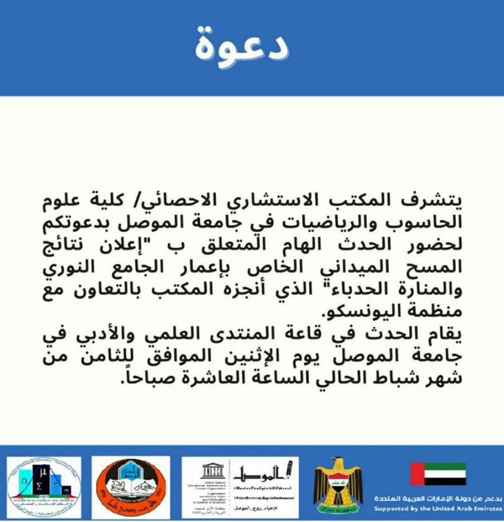 بالتعاون بين جامعة الموصل – المكتب الاستشاري الاحصائي / كلية علوم الحاسوب والرياضيات ومنظمة الامم المتحدة للتربية والعلوم والثقافة (UNESCO) ندعوكم لحضور الندوة المتعلقة ” اعلان نتائج المسح الميداني الخاص باعمار الجامع النوري و منارة الحدباء ” ، وذلك في قاعة المنتدى العلمي والادبي يوم الاثنين ٨ شباط ٢٠٢١ ، الساعة العاشرة صباحاً .