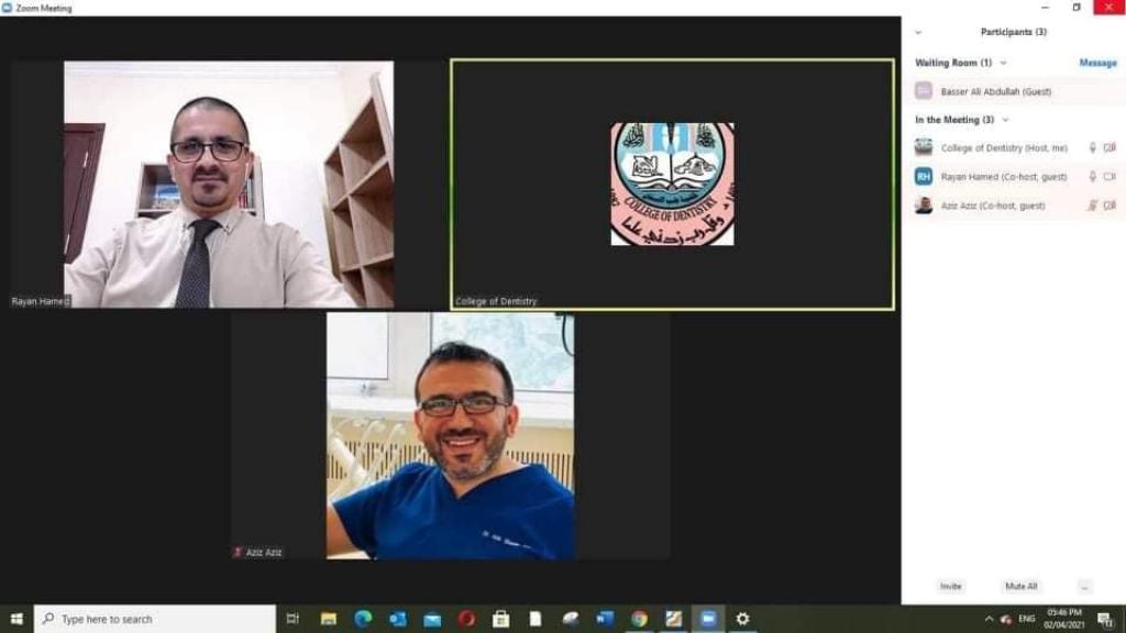 استضافت كلية طب الأسنان في جامعة الموصل الاستشاري ( نيكولاس درييج) من جامعة كارديف / المملكة المتحدة في محاضرة إلكترونية تفاعلية مهمة عن التشخيص التفريقي للآفات المعتمة في الفكين، بإشراف الاستاذ المساعد الدكتور ريان سالم حامد عميد الكلية ،يوم الأربعاء ١٤/ نيسان/٢٠٢١، حضرها عدد من أطباء الأسنان ومن تدريسيي وطلبة الكلية .