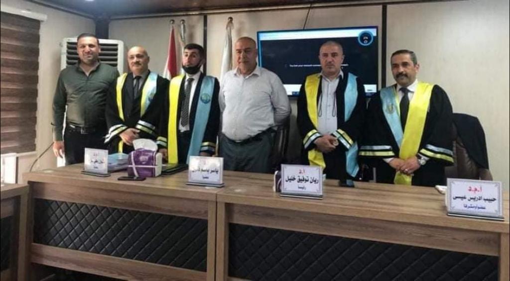 ترأس لجنة المناقشة الاستاذ الدكتور ريان توفيق خليل وعضوية الاستاذ الدكتور ياسر باسم ذنون والاستاذ المساعد الدكتور نشوان زكي سليمان واشراف الاستاذ المساعد الدكتور حبيب ادريس عيسى .