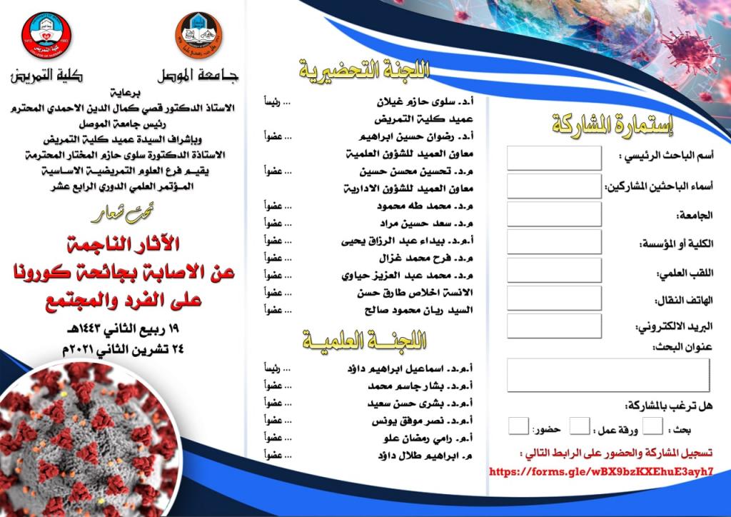 برعاية السيد رئيس جامعة الموصل الاستاذ الدكتور قصي كمال الدين الاحمدي وبإشراف السيدة عميد كلية التمريض الاستاذ الدكتورة سلوى حازم غيلان المختار ستقيم الكلية فرع العلوم التمريضية الاساسية المؤتمر العلمي الدوري الرابع عشر تحت عنوان ( الآثار الناجمة عن الاصابة بجائحة كورونا على الفرد والمجتمع ) يوم الاحد الموافق 24 تشرين الثاني 2021، تستقبل اللجنة العلمية للمؤتمر مساهمات الباحثين وملاحظاتهم على الرابط التالي :