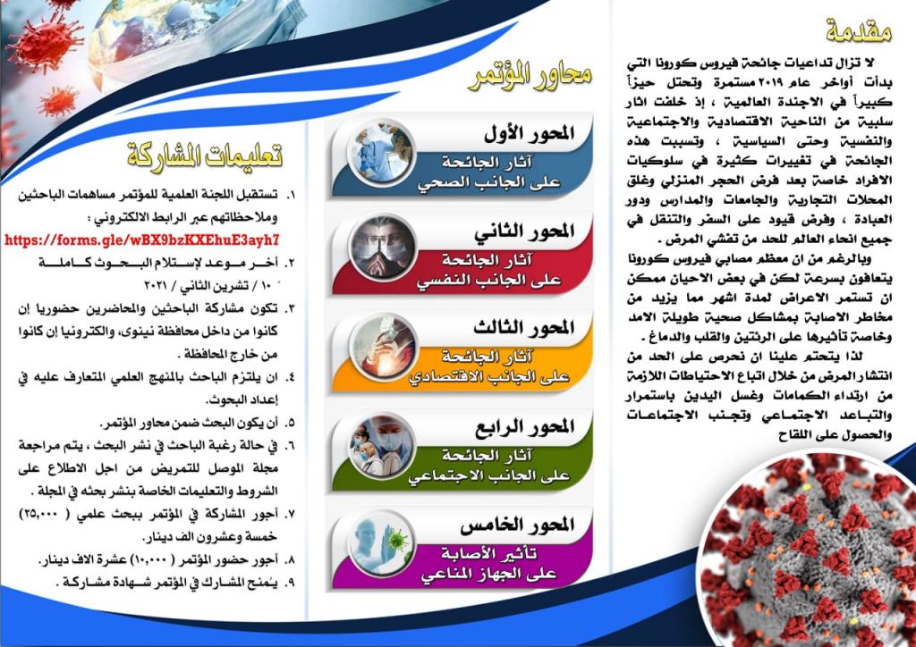 سيكون اخر يوم لاستلام البحوث كاملة يوم الاحد الموافق 10 تشرين الثاني 2021، وتكون مشاركة الباحثين والمحاضرين حضورياً بالنسبة للمتواجدين داخل محافظة نينوى والكترونيا لمن هم خارجها .