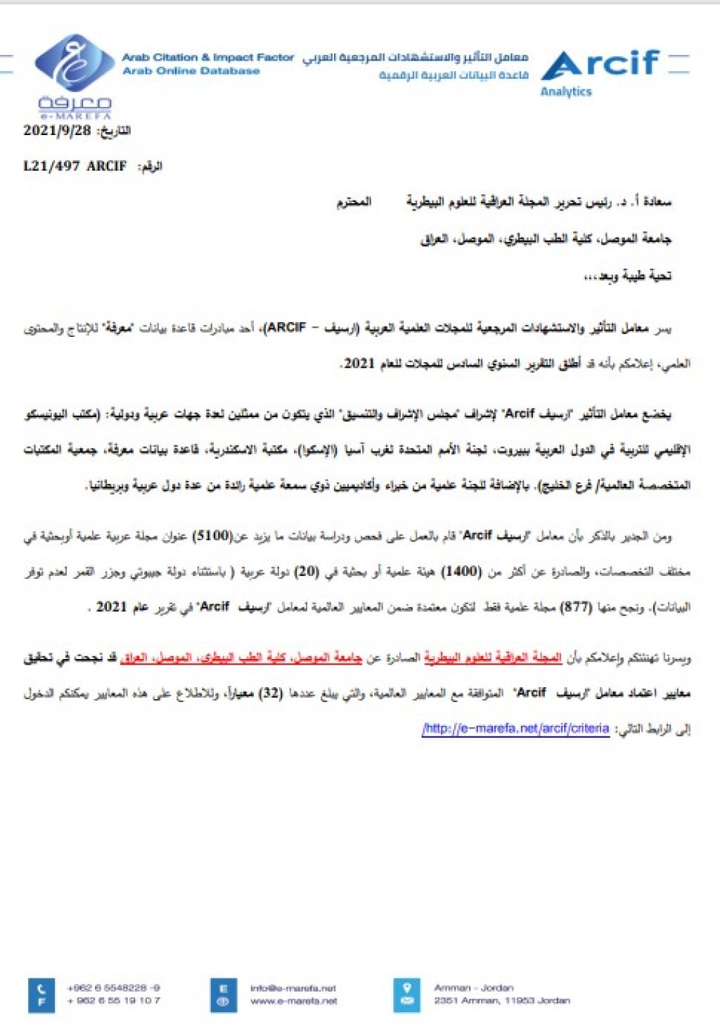 حققت المجلة العراقية للعلوم البيطرية التي تصدر عن كلية الطب البيطري في جامعة الموصل نجاحات متتالية مؤخراً فبعد ان تم تحولها من Q4 الى Q2 هذا العام، فهي اليوم تتقدم لتزف بشرى باحتلالها مراتب متقدمة في ما يعرف معامل التاثير والاستشهادات المرجعية العربي (Arcif) المتوافقة مع المعايير العالمية والتي يبلغ عددها 32 معياراً ، حيث تلقت ادارة المجلة اليوم هذه التهنئة من ادارة الموقع وقد صنفت المجلة ( Q1) ضمن المجلات الطبيعية والحياتية ، و (Q2) ضمن المجلات البيطرية .