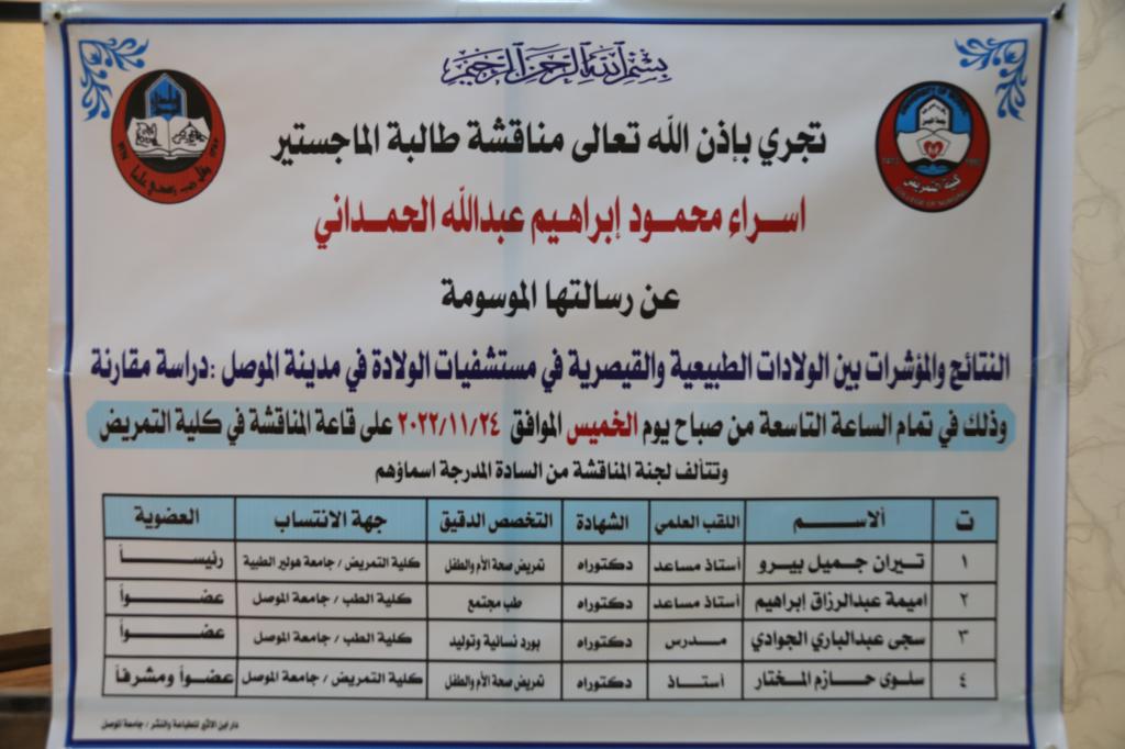 المساعد الدكتورة اميمة عبد الرزاق ابراهيم والمدرس الدكتورة سجى عبد الباري الجوادي وبإشراف وعضوية الاستاذ الدكتورة سلوى حازم المختار عميد كلية التمريض جامعة الموصل .
