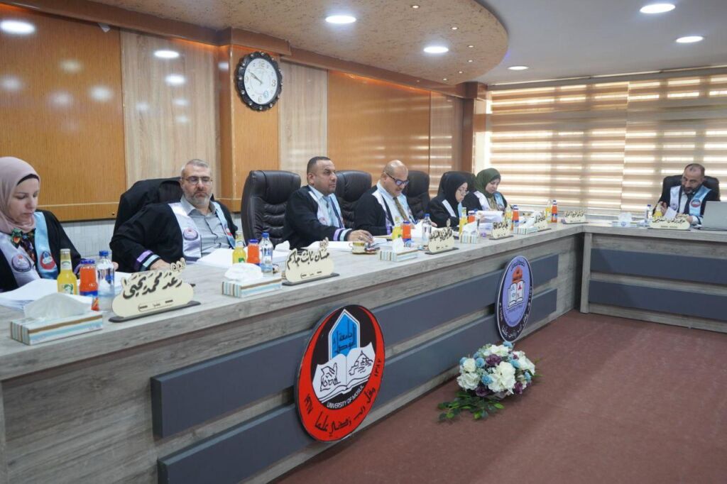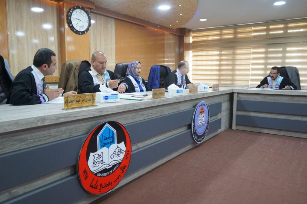 ترأس لجنة المناقشة الأستاذ الدكتور سعد محمود الكواز , وبعضوية كلاً من الأستاذ الدكتور باسم حازم حميد من جامعة بغداد، والأستاذ المساعد الدكتور أوس فخر الدين أيوب، والأستاذ المساعد الدكتورة دعاء نعمان الحسيني، والأستاذ المساعد الدكتورة رقية خلف حمد، وعضوية وإشراف الأستاذ المساعد الدكتورة إيمان مصطفى رشاد .