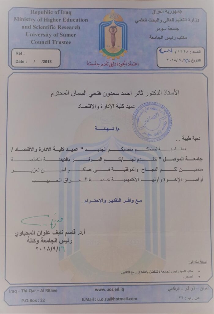 السيد عميد الكلية يتسلم برقية تهنئة من السيد رئيس جامعة سومر