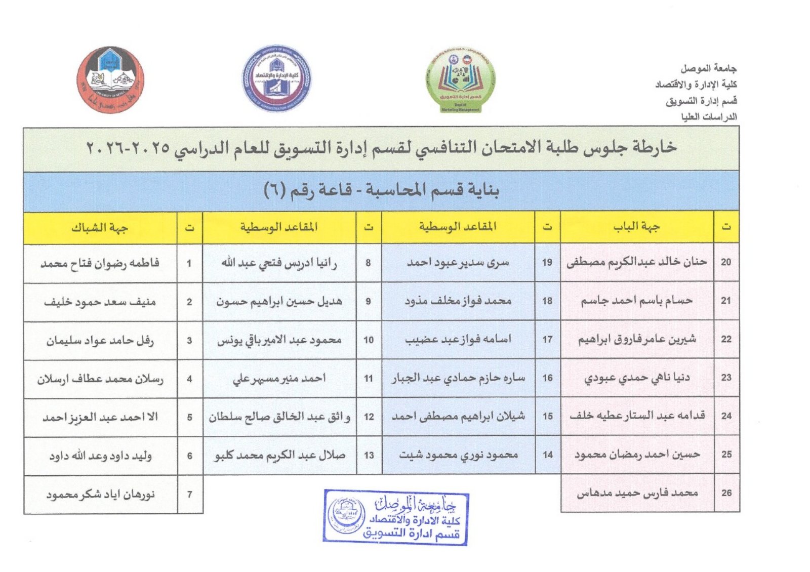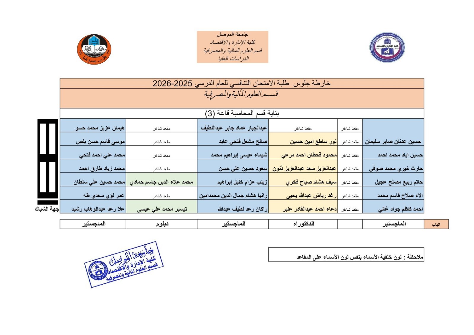 تُعلن كلية الإدارة والاقتصاد – جامعة الموصل عن نشر خارطة جلوس الطلبة المتقدمين لأداء الامتحان التنافسي للقبول في برامج الدراسات العليا (الدبلوم العالي، الماجستير، الدكتوراه) للعام الدراسي 2025–2026، وذلك لجميع الأقسام العلمية في الكلية.