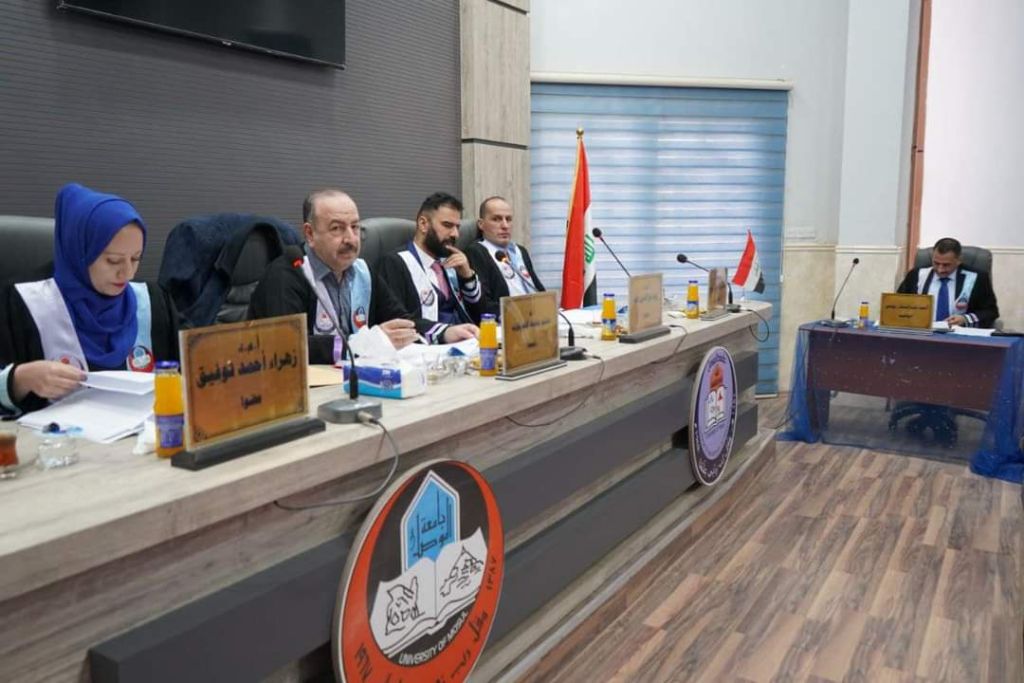 ترأس لجنة المناقشة الأستاذ الدكتورة الآء حسيب الجليلي , وبعضوية كلاً من الأستاذ الدكتور رعد عدنان رؤوف والأستاذ المساعد الدكتور حسين وليد حسين من وزارة التعليم العالي والبحث العلمي/ جهاز الاشراف والتقويم العلمي والاستاذ المساعد الدكتورة إيمان بشير محمد والأستاذ المساعد الدكتور أحمد حسين الجرجري وعضوية وإشراف الأستاذ الدكتور معن وعدالله المعاضيدي .