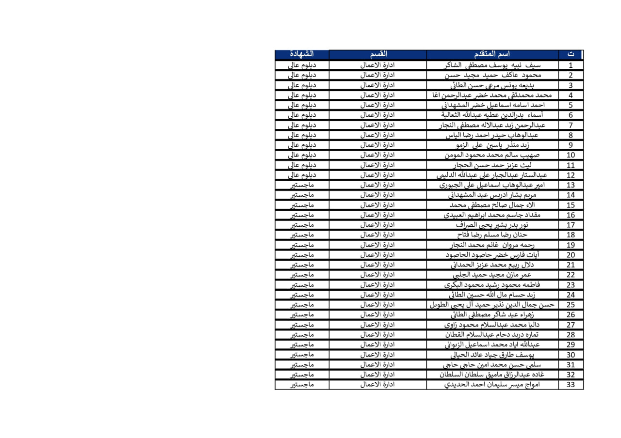 جدول بيانات بلاالمؤهلين لاداء الامتحان التنافسي لبرامج الدراسات العليا 2025-2026 كلية الادارة والاقتصاد - جامعة الموصل عنوان