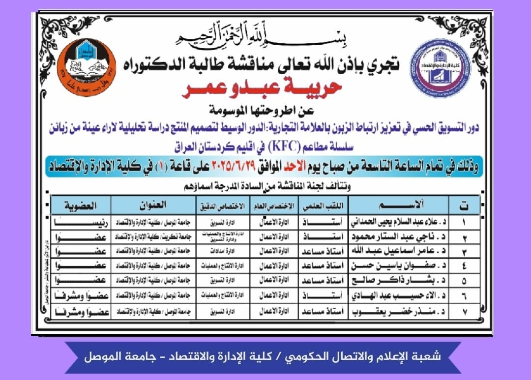 ناقش قسم إدارة التسويق في كلية الإدارة والاقتصاد – جامعة الموصل، يوم الثلاثاء الموافق 1 تموز 2025، رسالة الماجستير الموسومة: "دور أبعاد الذكاء التنافسي في [إقرأ المزيد]