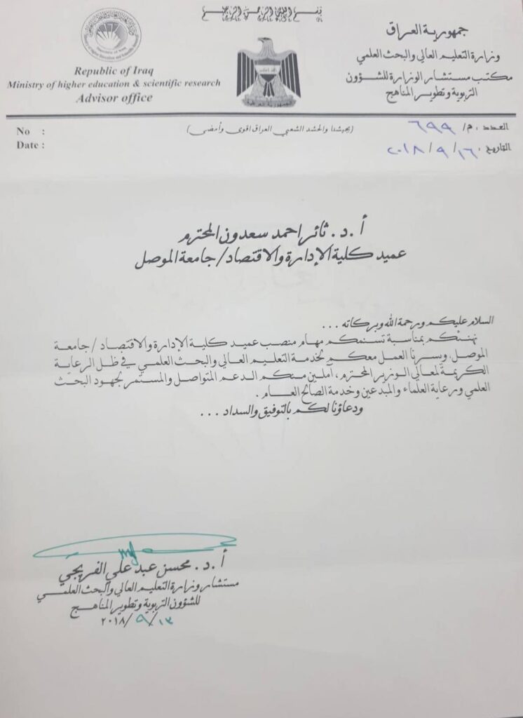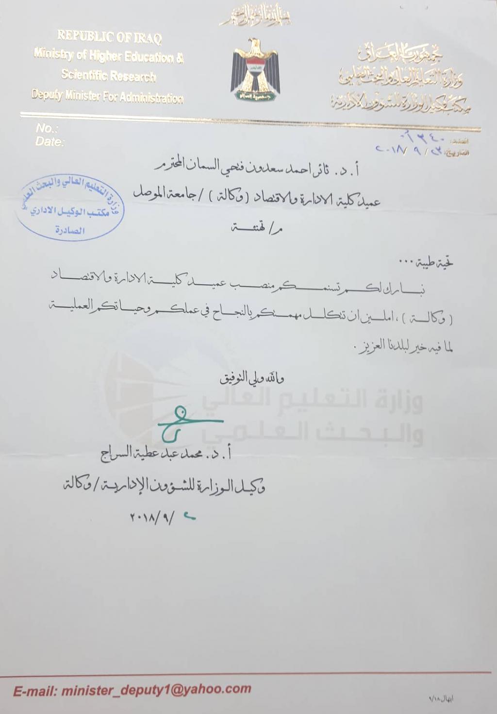تلقى السيد عميد الكلية الاستاذ الدكتور ثائر احمد سعدون السمان برقية تهنئة من السيد وكيل الوزارة للشؤون الادارية الاستاذ الدكتور محمد عبد عطية السراج بمناسبة تسنمه المنصب الجديد .