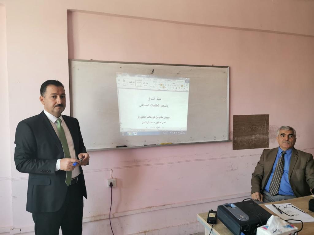 ضمن الانشطة العلمية لطلبة الدكتوراه في قسم الاقتصاد الكورس الثالث للعام الدراسي 2018- 2019قدم كل من الطالب عدي صابور محمد سمِنار بعنوان ( هيكل السوق وتسهيل المنتجات الصناعية ) و قدم الطالب خضر جاسم حمد سمِنار بعنوان ( الاقتصاد الصناعي الاقتصاد الأخضر ) و قدمت الطالبة لورا باسم سمِنار بعنوان ( التوطن الصناعي وأثره على التوازن البيئي) يوم الاربعاء الموافق 2019/11/13بإشراف الأستاذ الدكتور أنمار امين البرواري