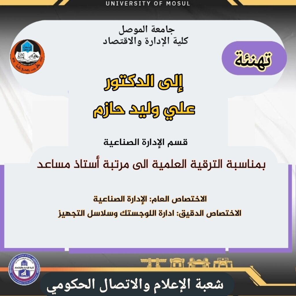 تهنئة بمناسبة الترقية العلمية الى الدكتور محمد عصام احمد مرتبة استاذ مساعد