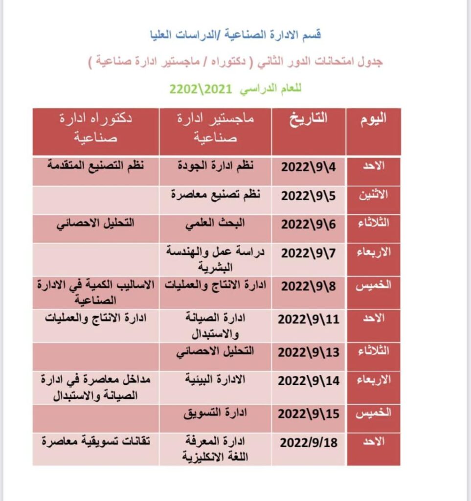 جدول الامتحانات النهائية للدراسات العليا الدور الثاني لقسم الإدارة الصناعية للعام الدراسي 2021_2022شارع المجموعة الثقافية الرئيسي