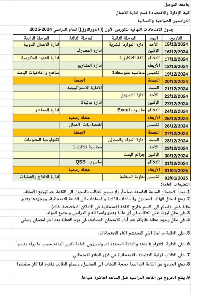 جدول امتحانات نهائية الكورس الأول للعام الدراسي ٢٠٢٤/٢٠٢٥ لطلبة الدراسات الأولية المراحل (الثانية-الثالثة – الرابعة) الدراستين الصباحية والمسائية لقسم الادارة الصناعية .